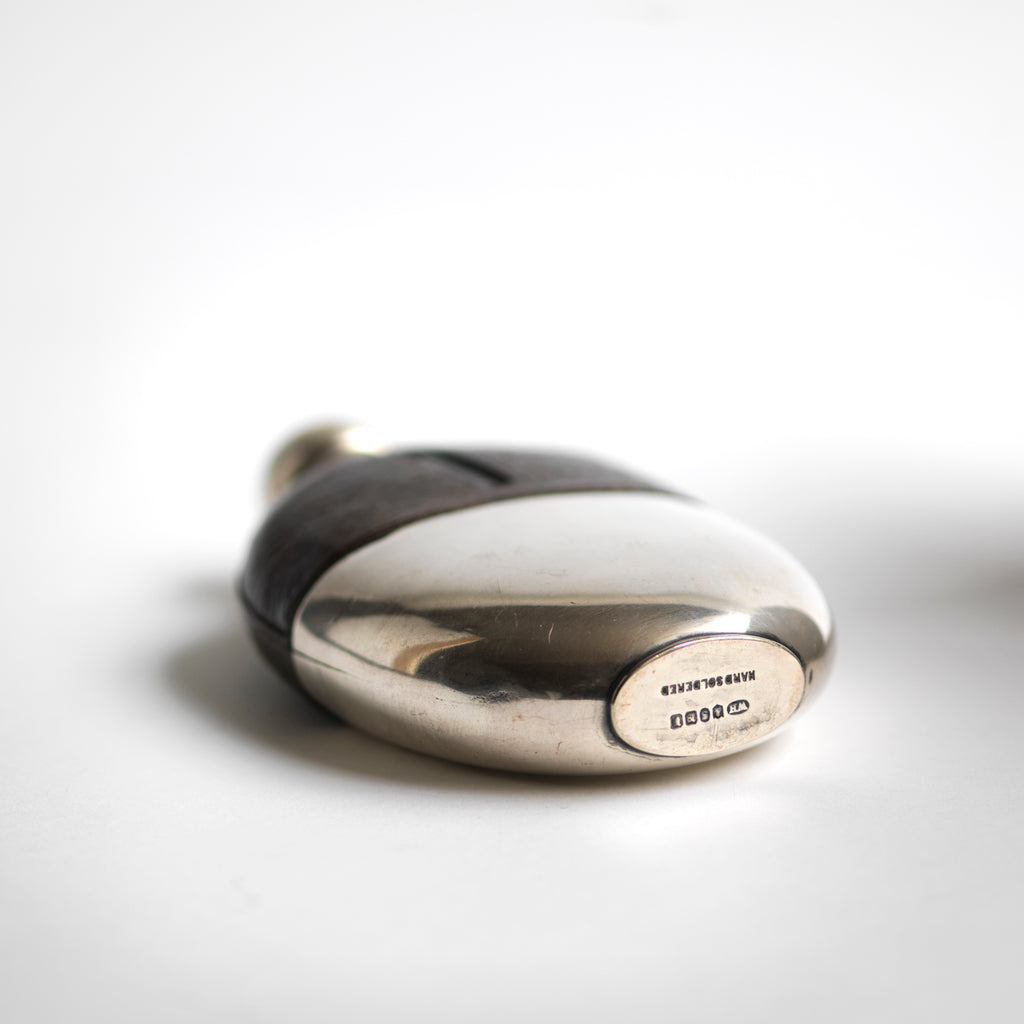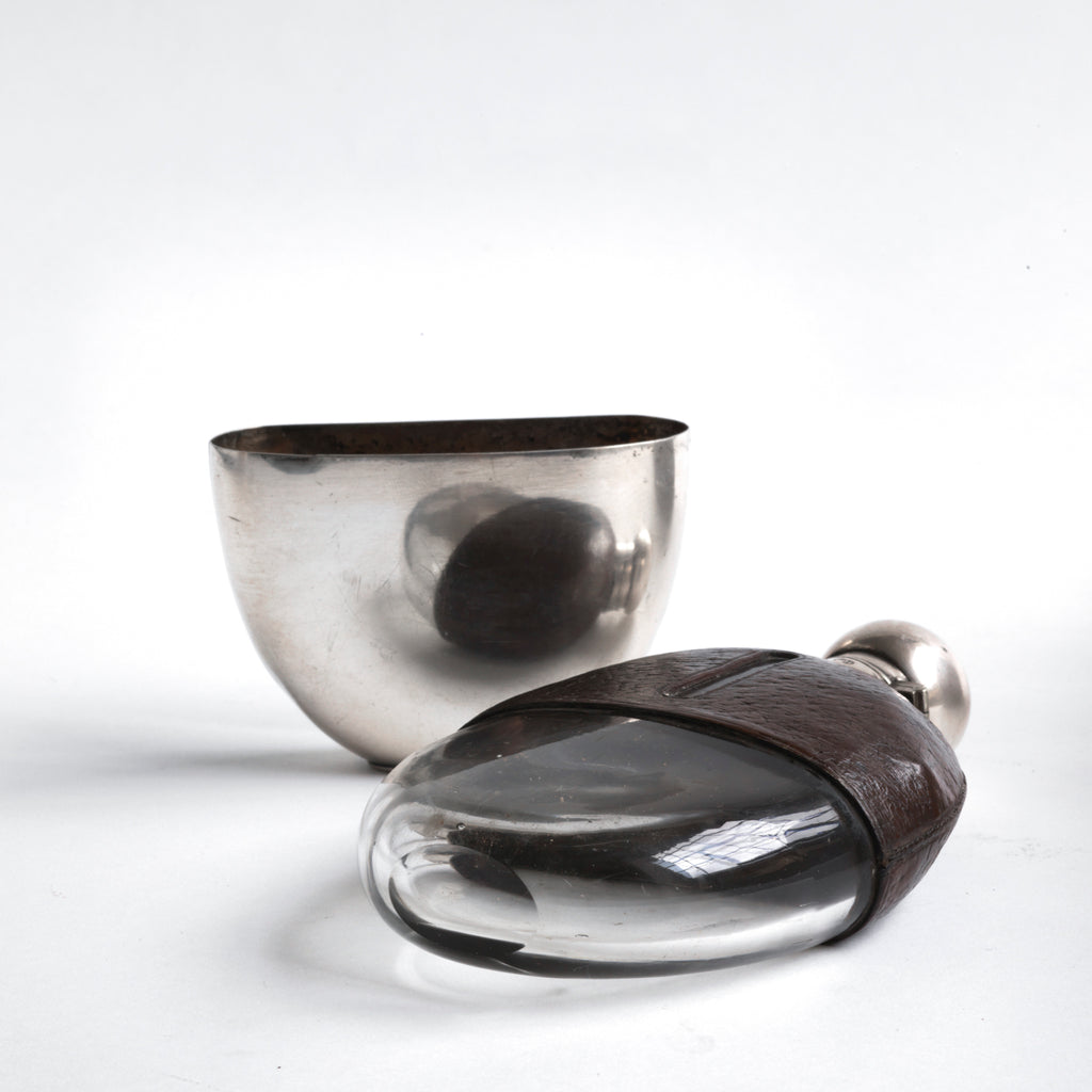 A high-quality Edwardian silver plated, glass and brown leather hip flask with a domed bayonet and hinged top by William Hutton & Sons. The base is stamped "WS & S" for William Hutton & Sons Ltd, and it was most likely retailed at the turn of the 19th century from one of their London showrooms, either in Holborn or Farringdon Road.