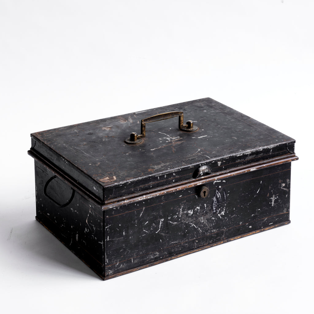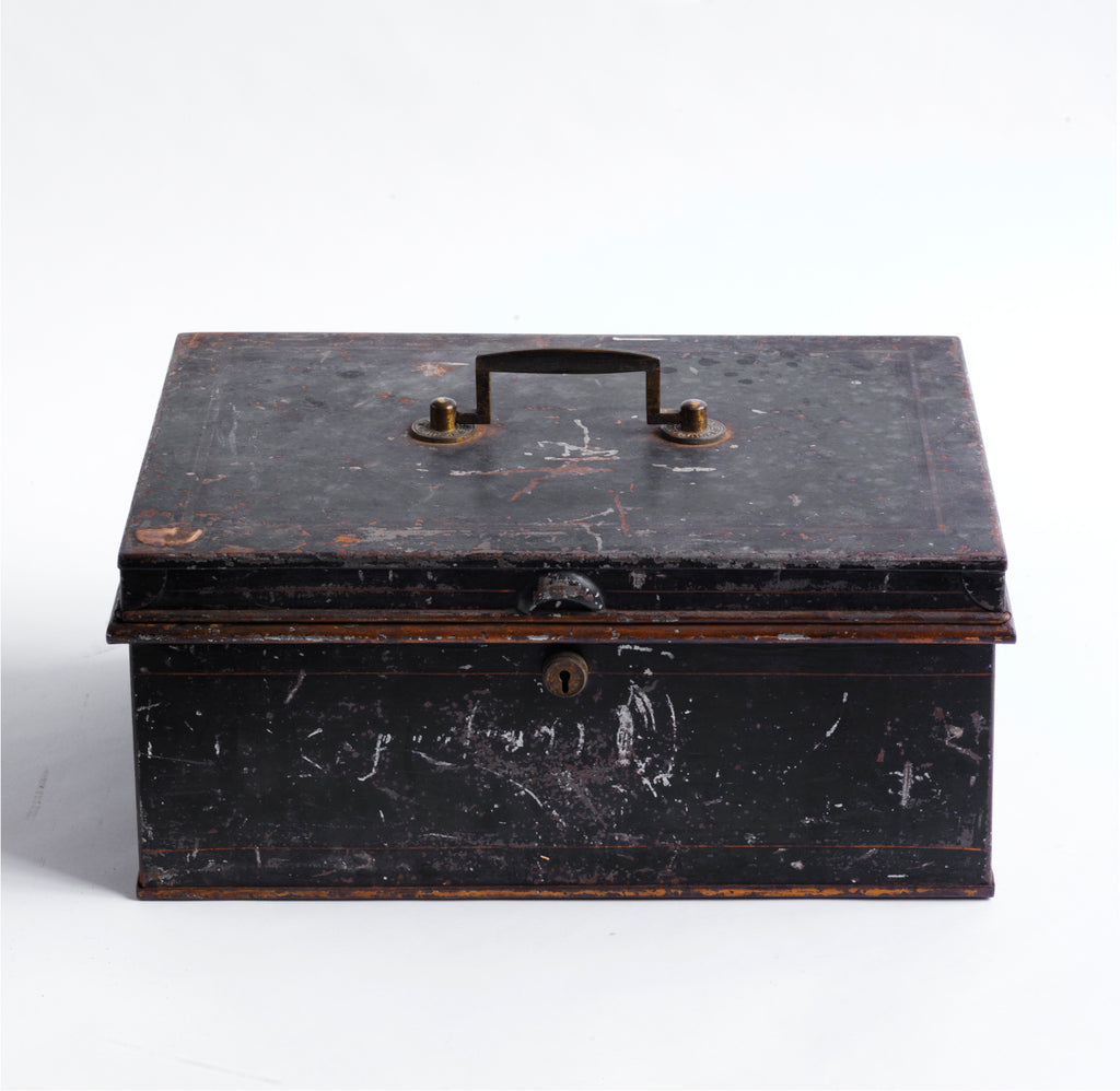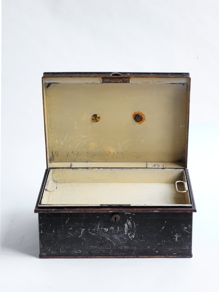 A beautifully proportioned early Victorian document tin with hinged brass carrying handle and lock made by Hobbs & Co, Cheapside, London. The original black painted finish has an ox-blood coloured linear border on each side, and the interior has a removable twin-handled tray in its original cream painted finish. The tin once held important wills, papers and effects, and was recently unearthed from the vaults of a vacated Clerkenwell Victorian solicitors' offices. The brass handle is moulded with "Hobbs & Co Cheapside London" and the lock "Hobb & Co" by appointment with royal crest.