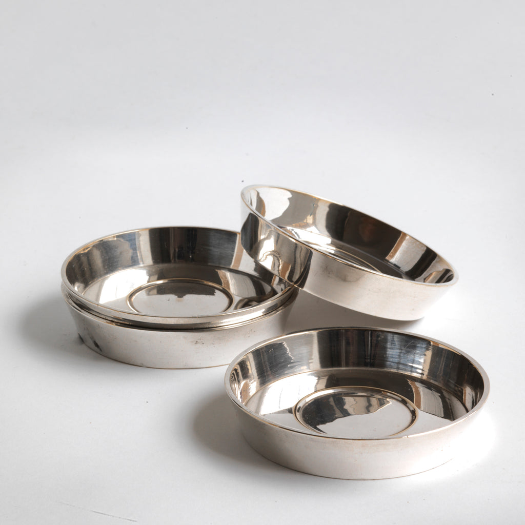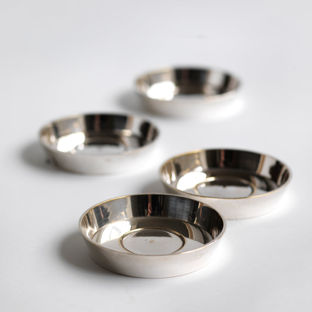 For the standing of drinks and cocktail shakers, or for the holding of cocktail sticks and bar snacks, these wonderful silver plated shallow flat-base dishes have a myriad of uses - and would once have been in service in a grand hotel. They have lovely weight and we are selling them as a set of 4.