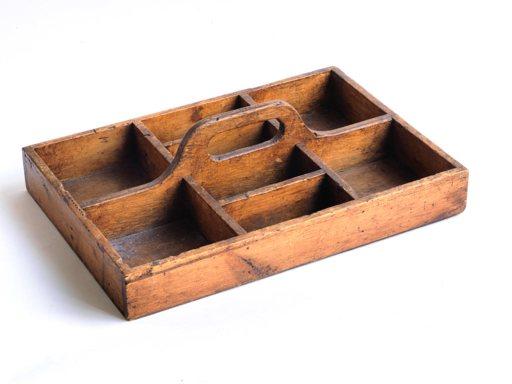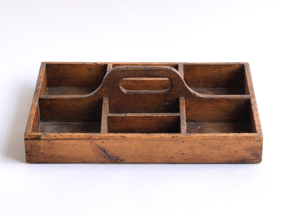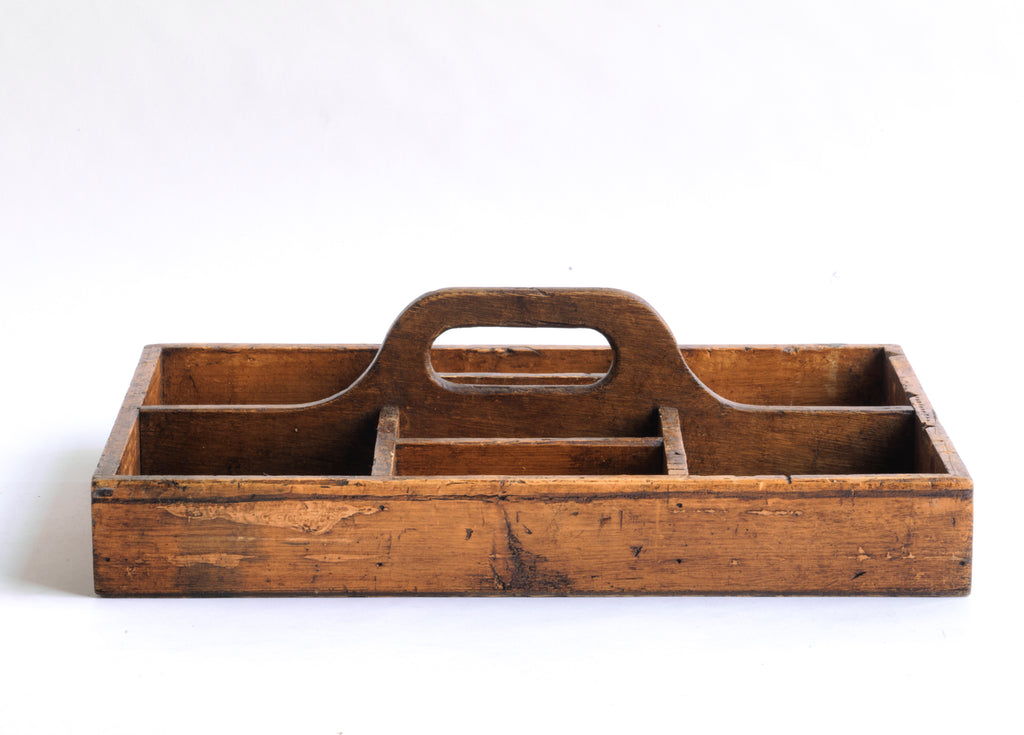A well proportioned antique stained pine housekeeper's tidy with integrated handle. It could also be used to house utensils, tools, artist's materials or act as a shoe cleaning box. In fact it's totally purposeful.