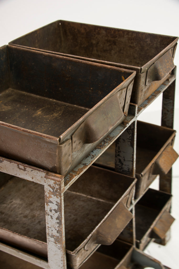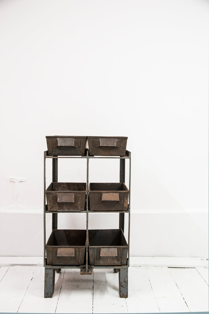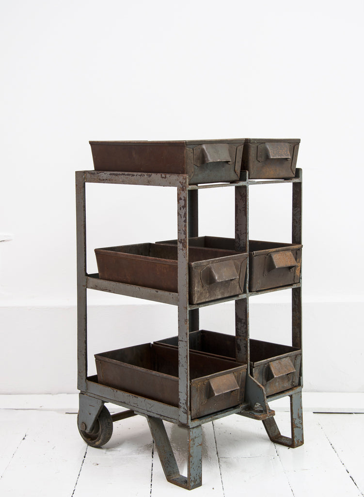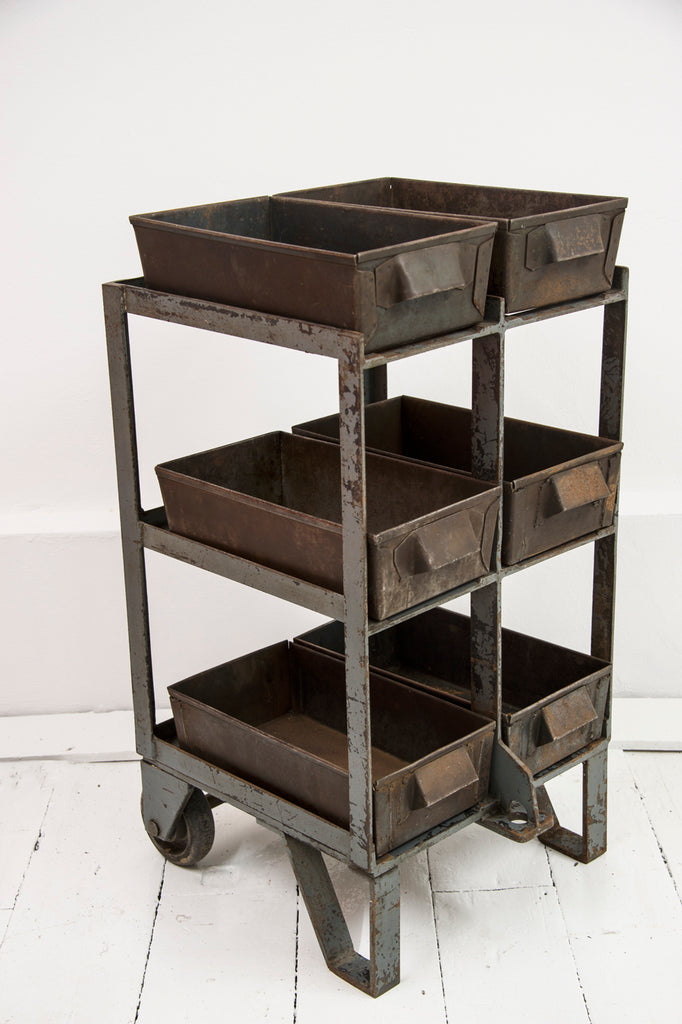 A heavy-duty set of 6 drawer bins on a toughened steel stand. Each bin is fitted either end with welded handles and is carried on a grey painted frame. The stand is painted grey and fitted with two wheels, so that when slightly tipped it can be easily repositioned. Apart from being ideal for tool storage in the workshop, studio, garage or garden shed, it could also work well in a contemporary space as a piece of kitchen, office or bathroom furniture.