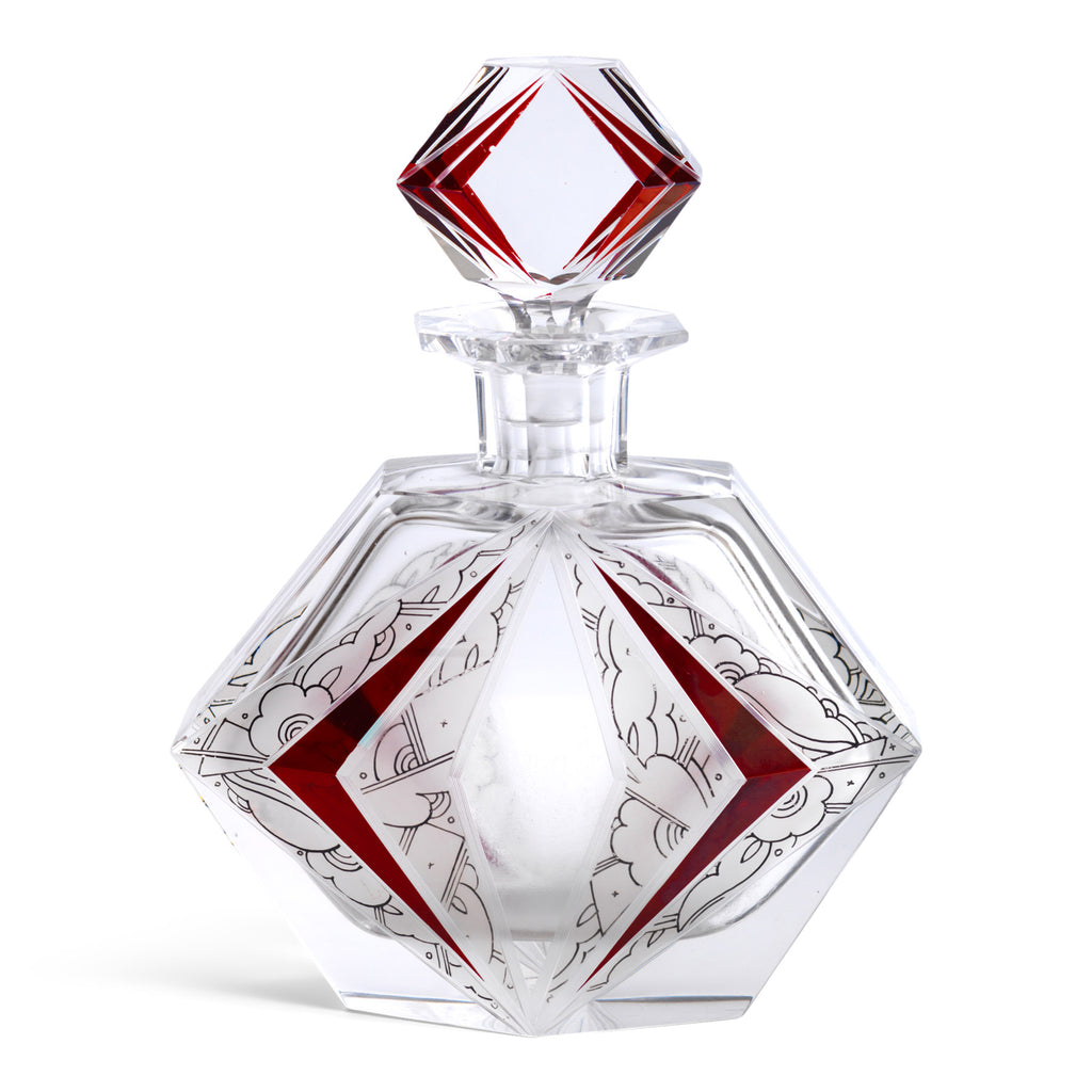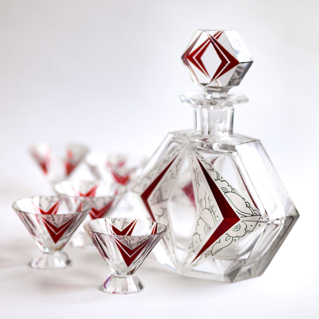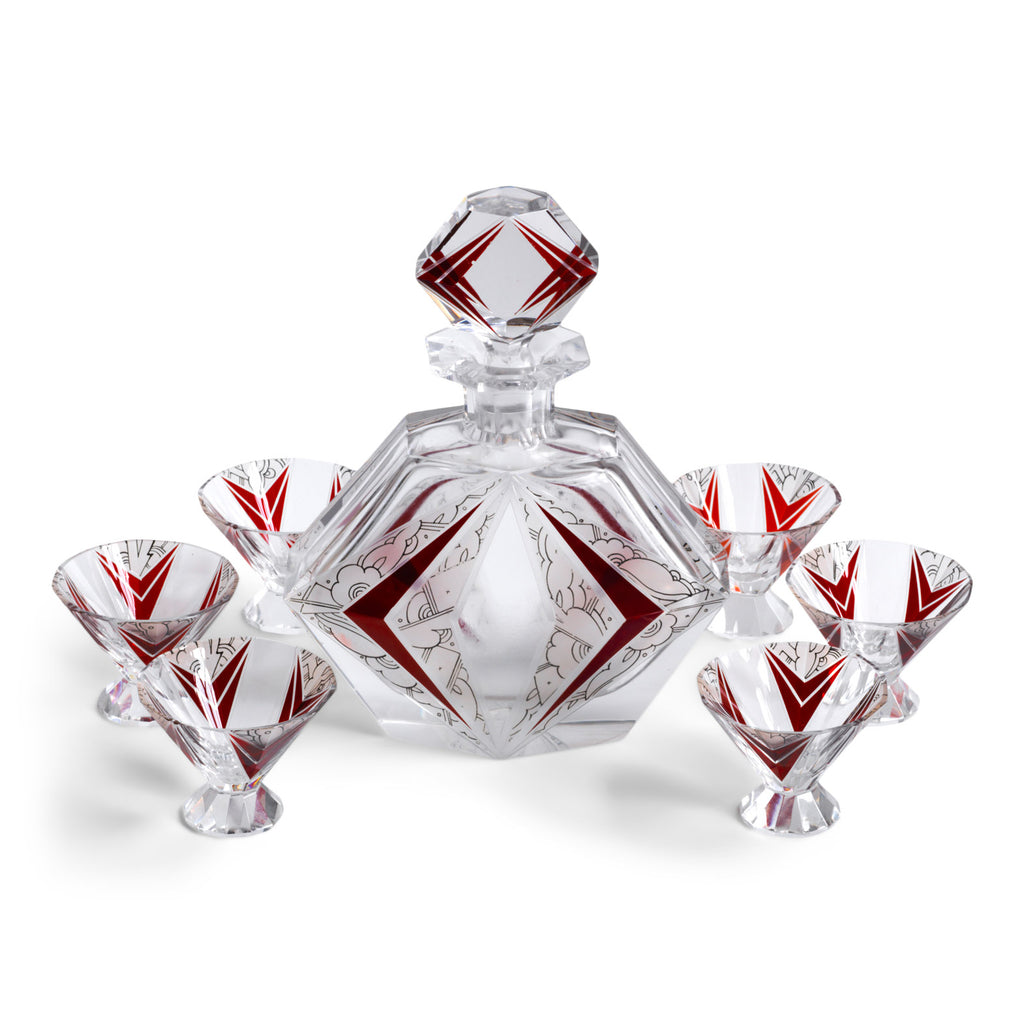 A stunning and rare Art Deco etched black and ruby glass decanter set designed by Karl Palda c.1930. The set comprises of a decanter with stopper and six conical shaped facet cut glass cocktail glasses, each with a flaring foot. Each piece is decorated with pure Art Deco geometric florals and red chevrons, and to stunning effect. The decanter also includes frosted panels. And better still, considering its age, the condition is wonderful, with all glasses present and correct. These Palda decanter sets are rare and this is a particularly fine jazz-age example.