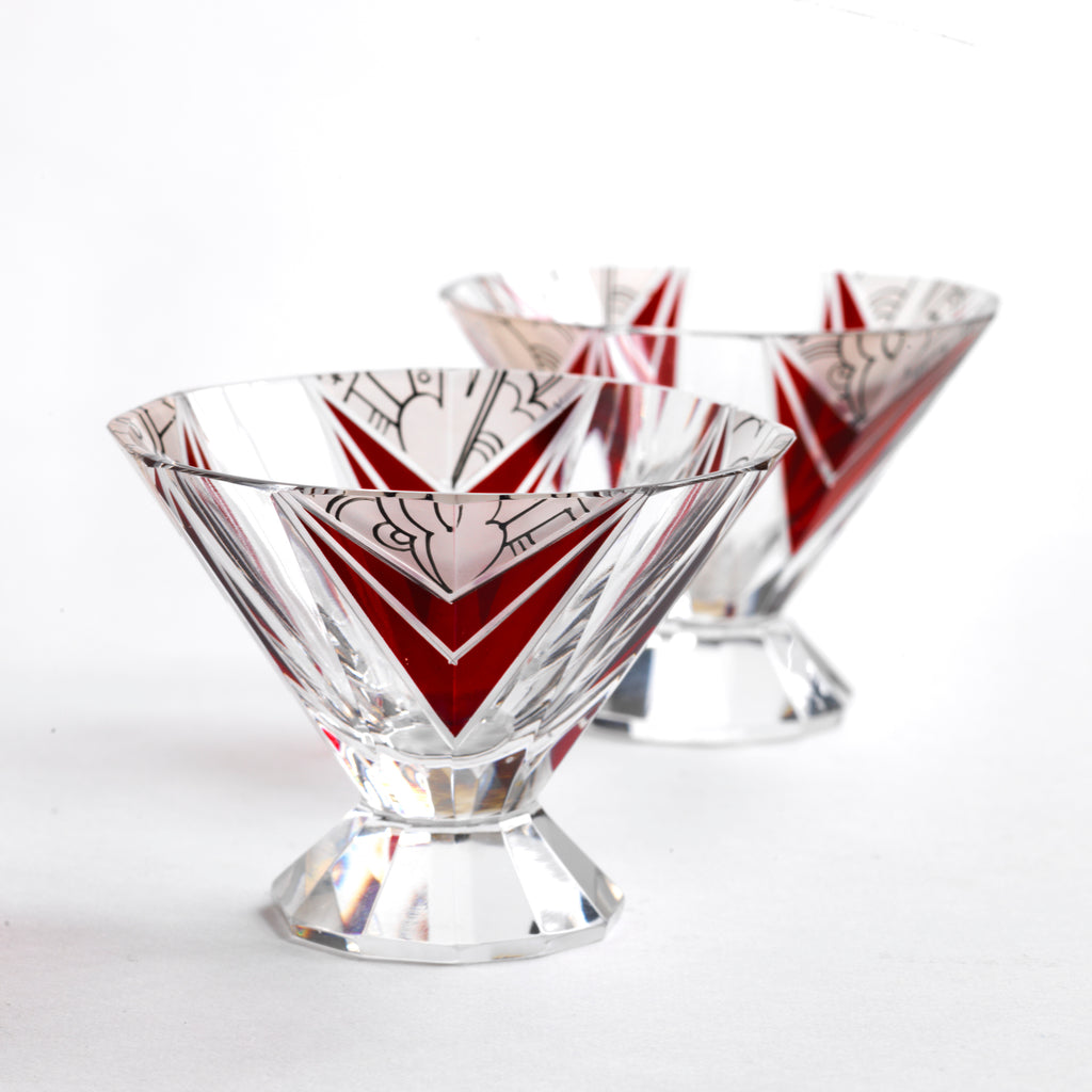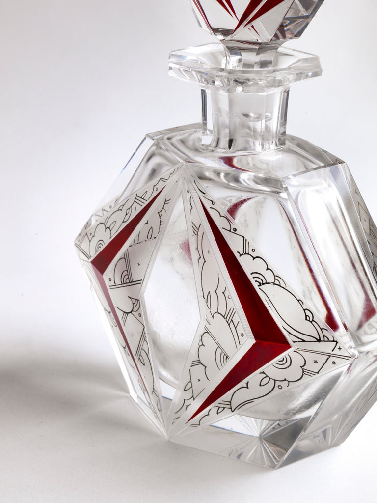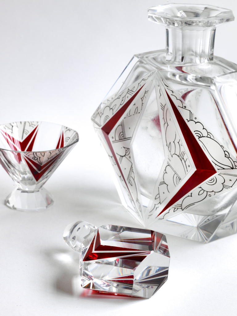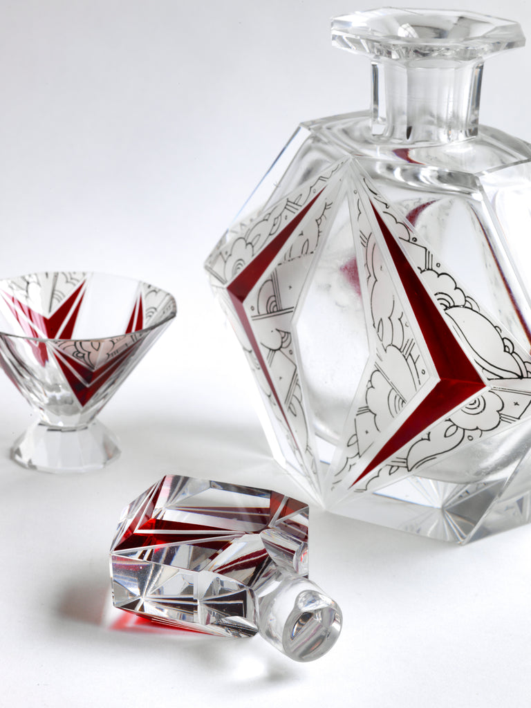 A stunning and rare Art Deco etched black and ruby glass decanter set designed by Karl Palda c.1930. The set comprises of a decanter with stopper and six conical shaped facet cut glass cocktail glasses, each with a flaring foot. Each piece is decorated with pure Art Deco geometric florals and red chevrons, and to stunning effect. The decanter also includes frosted panels. And better still, considering its age, the condition is wonderful, with all glasses present and correct. These Palda decanter sets are rare and this is a particularly fine jazz-age example.