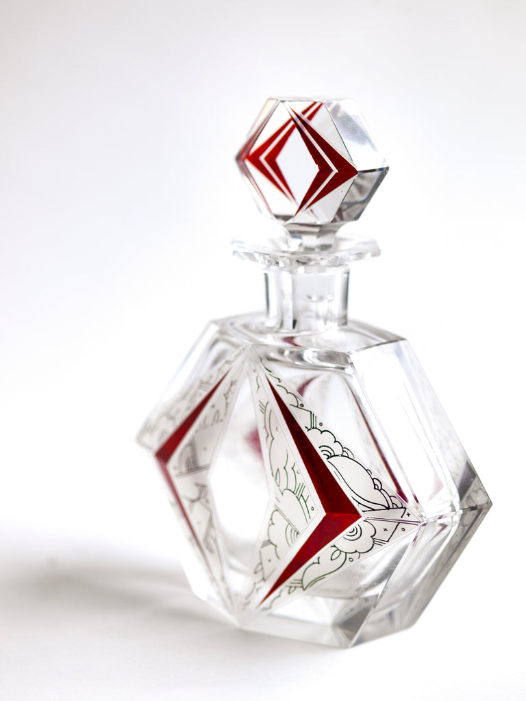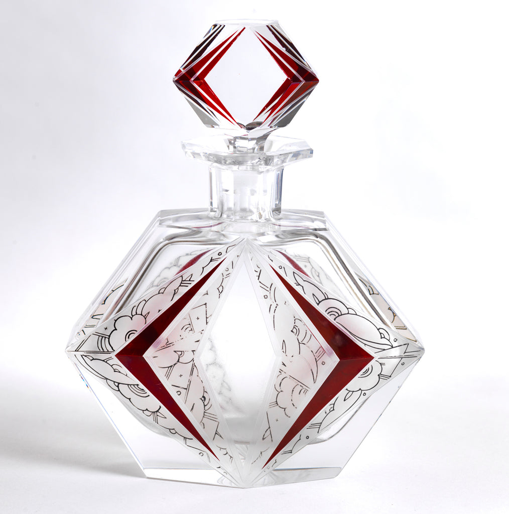 The firm of Karl Palda was founded in 1888 in Haida, Nový Bor, Czechoslovakia, yet it was the 1930s - and what we now call the Art Deco period - that proved to be its heyday. Karl Palda is synonymous with the most stylised and geometric of Art Deco designs, and produced a wonderful array of quality decanter sets, vases, candlesticks, vanity sets and perfume bottles throughout the 1930s. Below is a page from the Palda 1938 catalogue (now in the Corning Glass Museum) which shows a range of their more traditional colorful glass patterns.