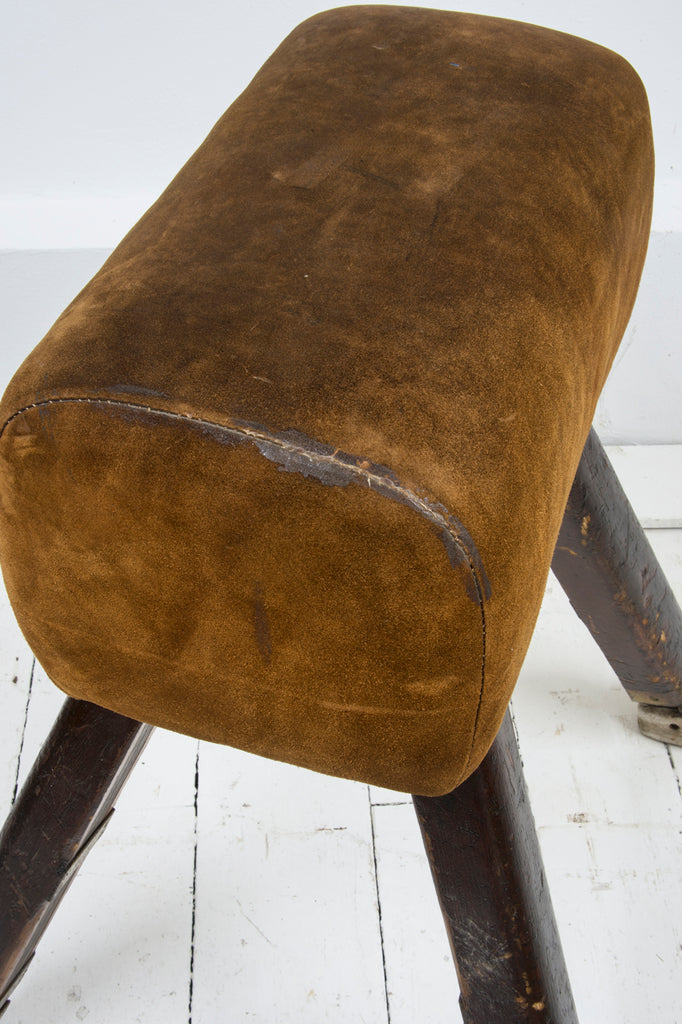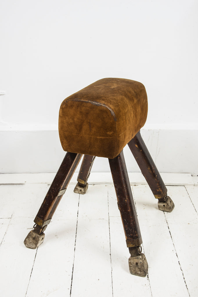 A handsome 1930s school gym horse with extending legs and original suede leather upholstered top. It would make a great sculptural addition to the home - and a fine clothes horse for the bedroom.