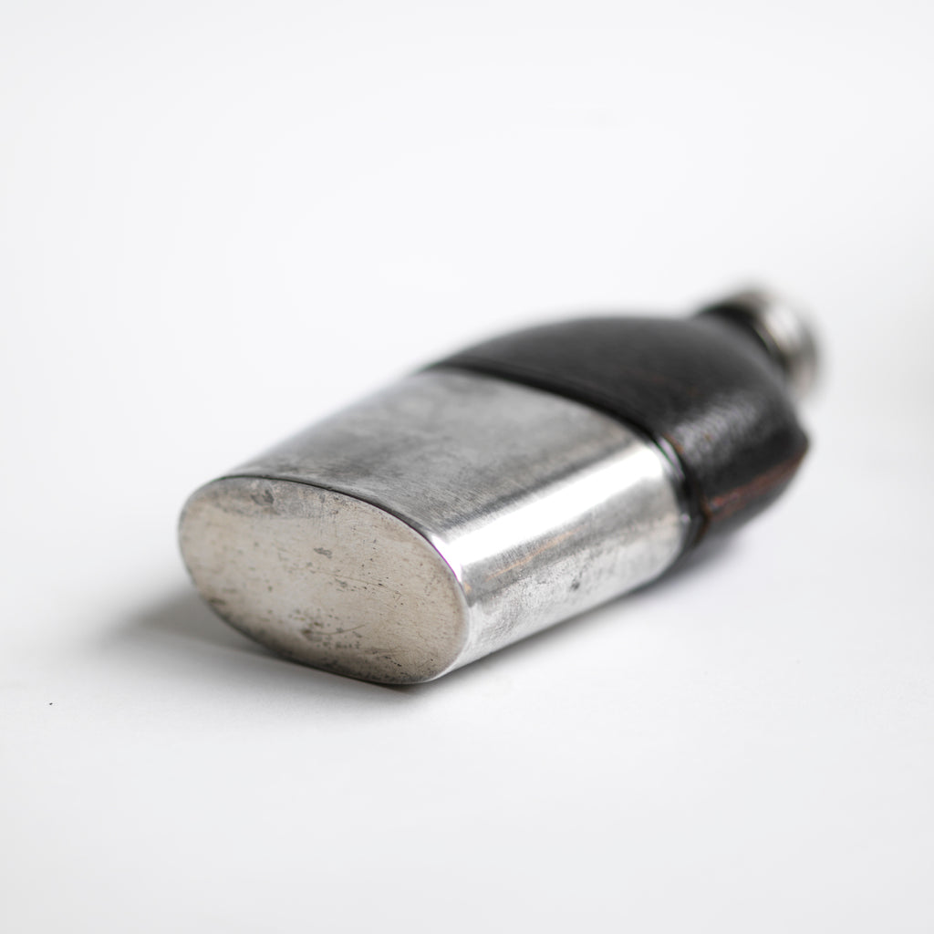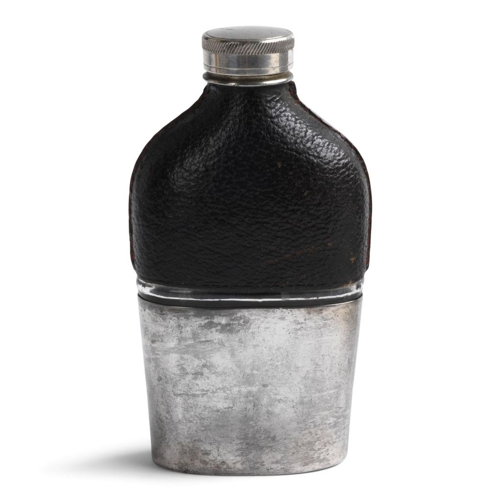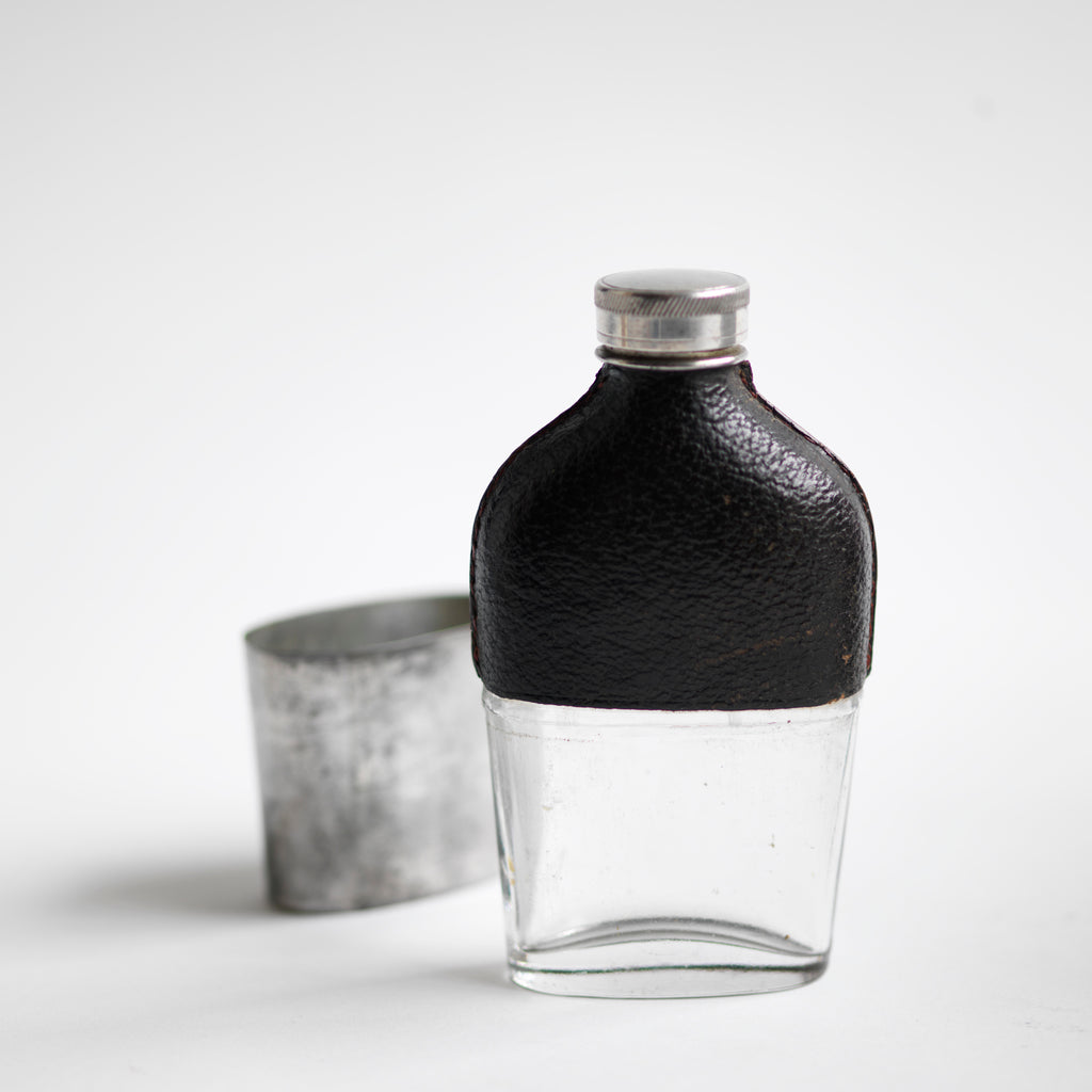 The clear glass body is half covered with leather, the lower half has a detachable silver plated cover that also acts as a cup. See images.