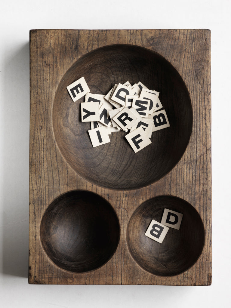 A very handsome coin organiser that would have once stood on a grocery store counter - as a handy dispenser for small change. Carved from a single block of oak, with three hollowed-out half-spheres, it has been polished smooth from its years of use, and has developed a wonderful hand-worn patina. Its shop work days may be over, yet it still makes a great organiser - for change, keys, or for all those bits and pieces that accumulate in the kitchen or on the desk. Its sculptural, tactile and pleasing form make it a great addition to the modern home.