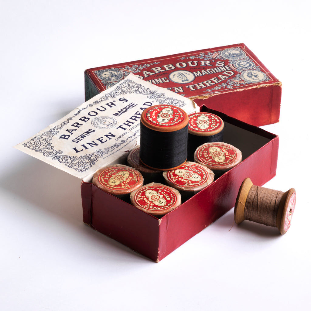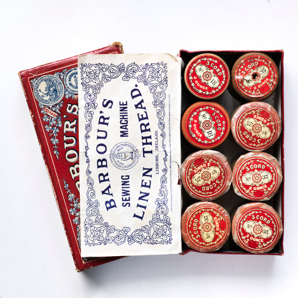 A glorious box of late Victorian Barbour branded cotton reels, each holding Irish black sewing machine thread. The box still holds the reels of thread it was sold with and also its branded Barbour inner paper lining, and some of the spools are still wrapped in their original papers. Each spool's end paper reads "3 cord 2 ounce". A charming slice of Ireland's linen and flax history and a fine example of Victorian typography and marketing.