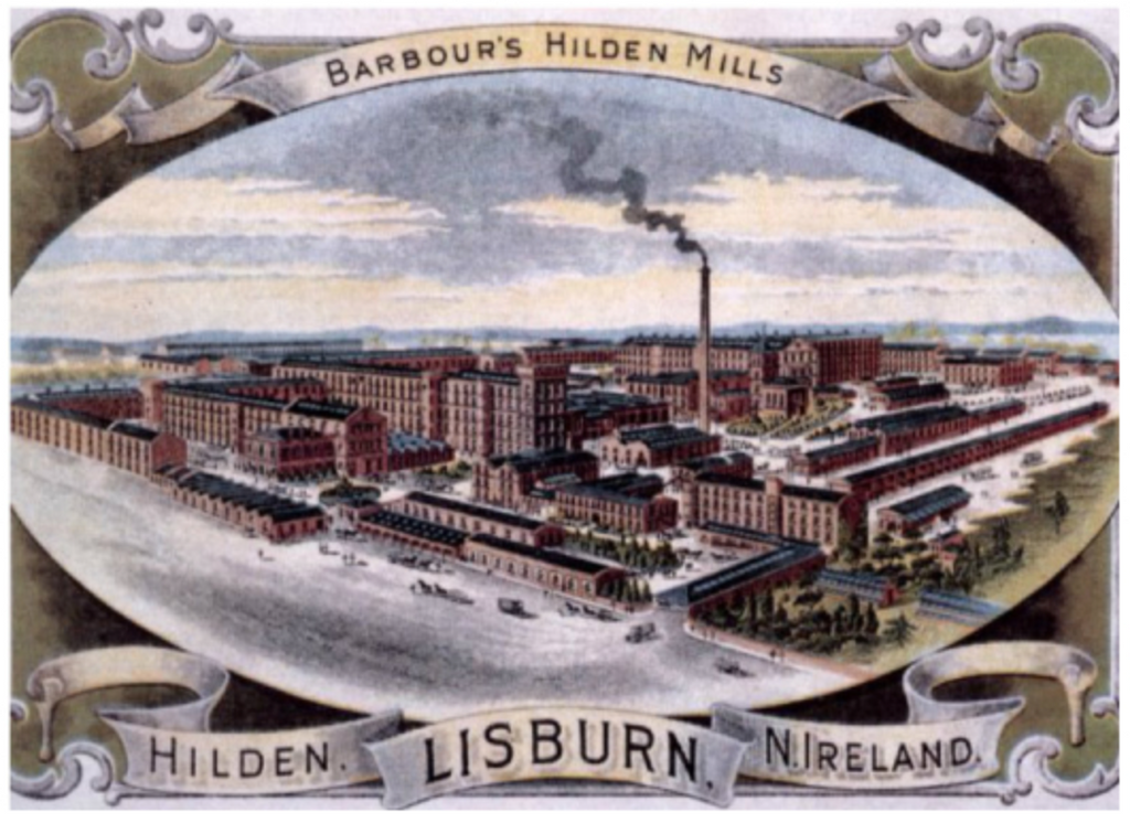Established by John Barbour at the Plantation, Lisburn, Co. Down, Ireland in 1784, Barbour’s linen-thread making mills grew to impressive proportions after their transfer to the water-powered Hilden site in 1823 (see image). By theend of the nineteenth century it held 30,000 spindles, 8000 twisting machines, and used up to 200 tons of coal per week to power all these tools – and was now considered the largest linen-thread manufacturer in the world. In 1898 the Irish, Scottish and American Barbour companies were merged into the Linen Thread Co Ltd. By the time war broke out in 1914, around 2000 people were employed at the Hilden Mill - and with their help the mill produced linen thread that was used to stitch war-time parachutes, uniforms, boots and knapsacks. Their thread helped stitch the UK together, and our wonderful original box of linen cottons stands testament to that.