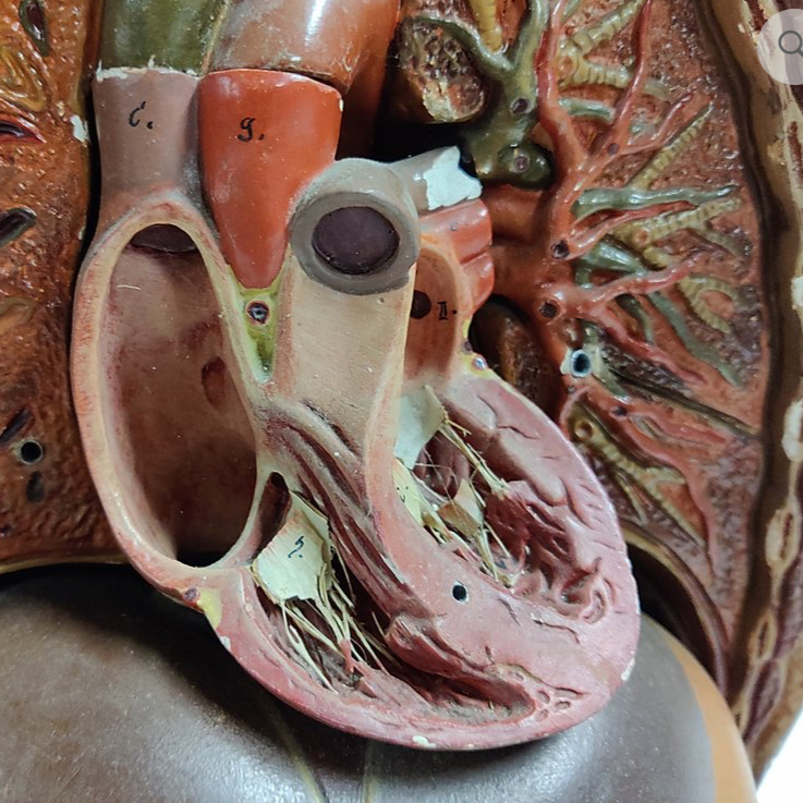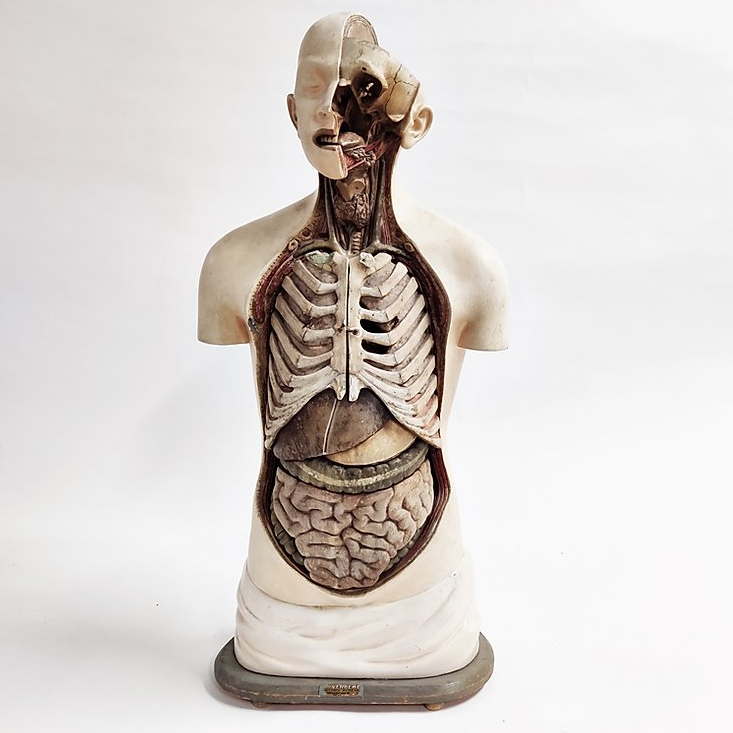 The plaster torso is mounted on a wooden base that has its original paper label. It has removable rib cage and organs, such as heart, lungs, liver and intestines. Each organ is delicately hand-painted and bears various numbers in fine script. There's even a little sprung hatch sited in the colon, and when opened it reveals the appendix (see image). The appeal of this model is that it is has a head and a rib cage, and has a beautiful pale-porcelain coloured finish.