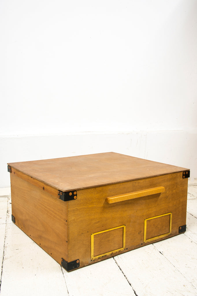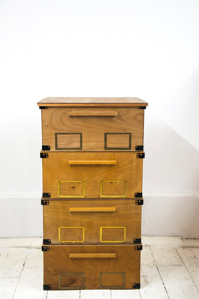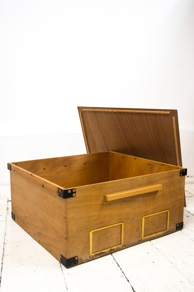 Constructed from plywood, they have drop-in lids and metal bound corners. Each is fitted with a pair of metal notice-plate holders for contents detailing, and with handle grips for ease of carrying. Barely used, the boxes were made more than 60 years ago to store artefacts belonging to the Victoria & Albert Museum, and were recently unearthed from a store room in Blythe House, West Kensington, London. See images. They make excellent at-home stacking storage and handsome coffee/side tables with ample storage for magazines and papers.