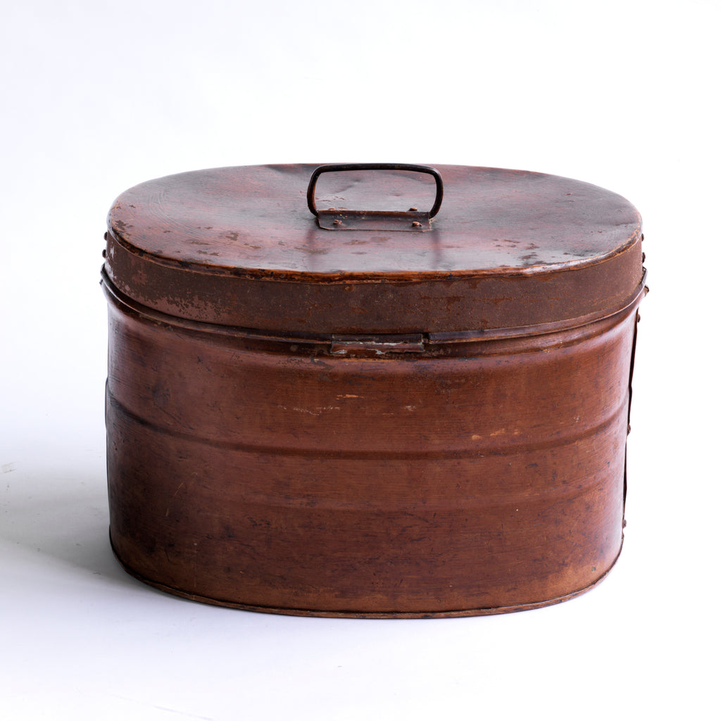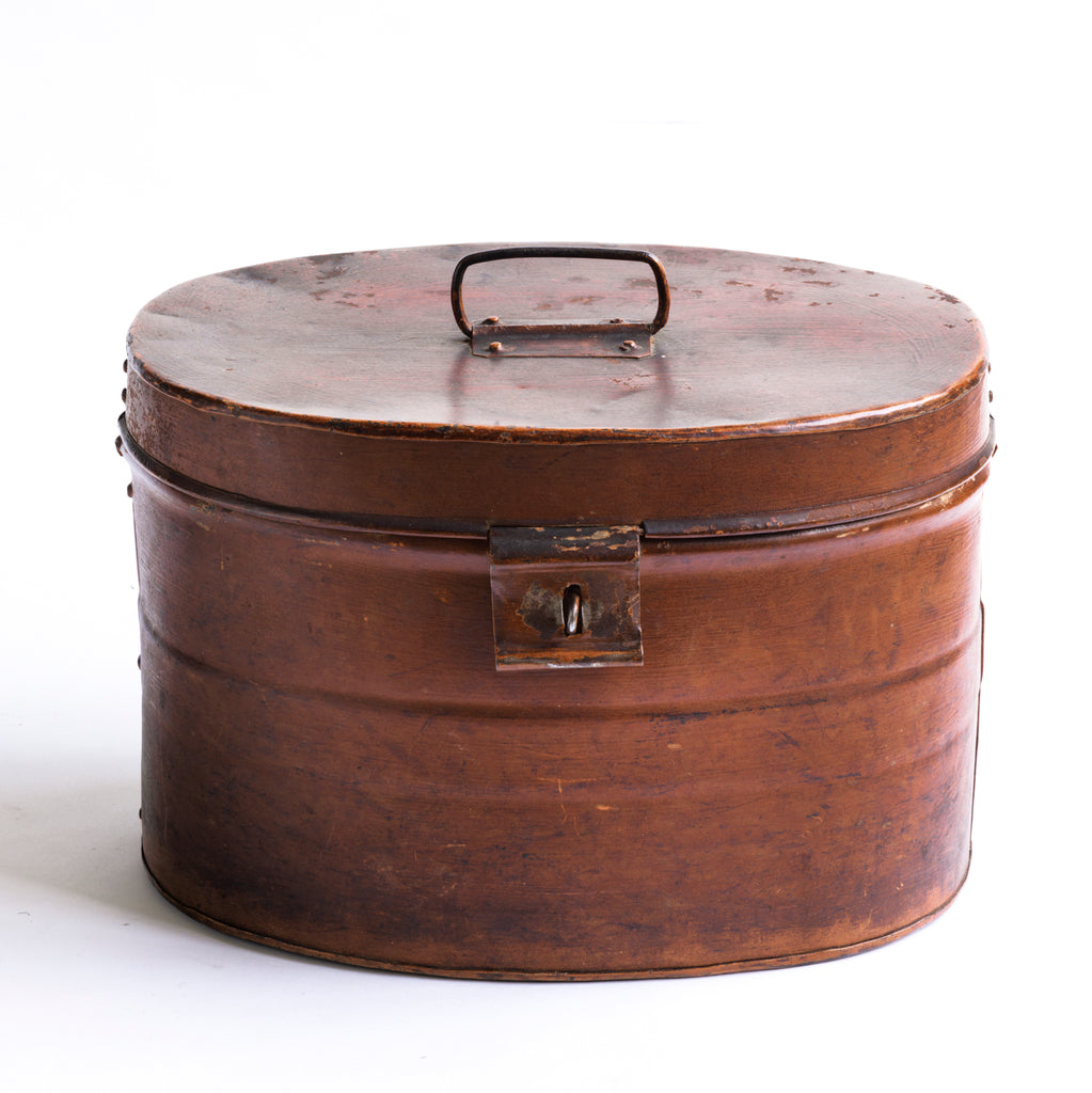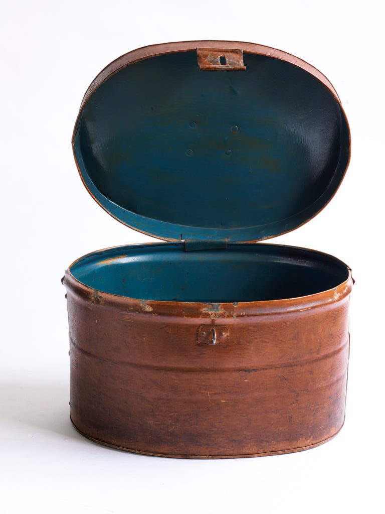 A handsome Victorian hat tin with hinged lid, carrying handle, hasp, and original pecan brown painted finish. The interior paint is also original and is a steely Prussian blue. It has a wonderful polished and buffed patina, the result of 130 years of travels.