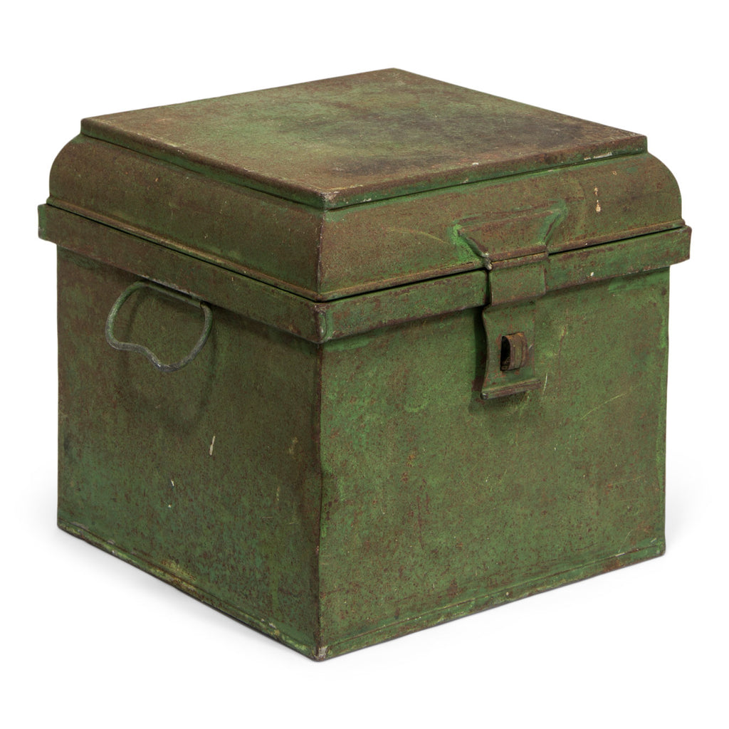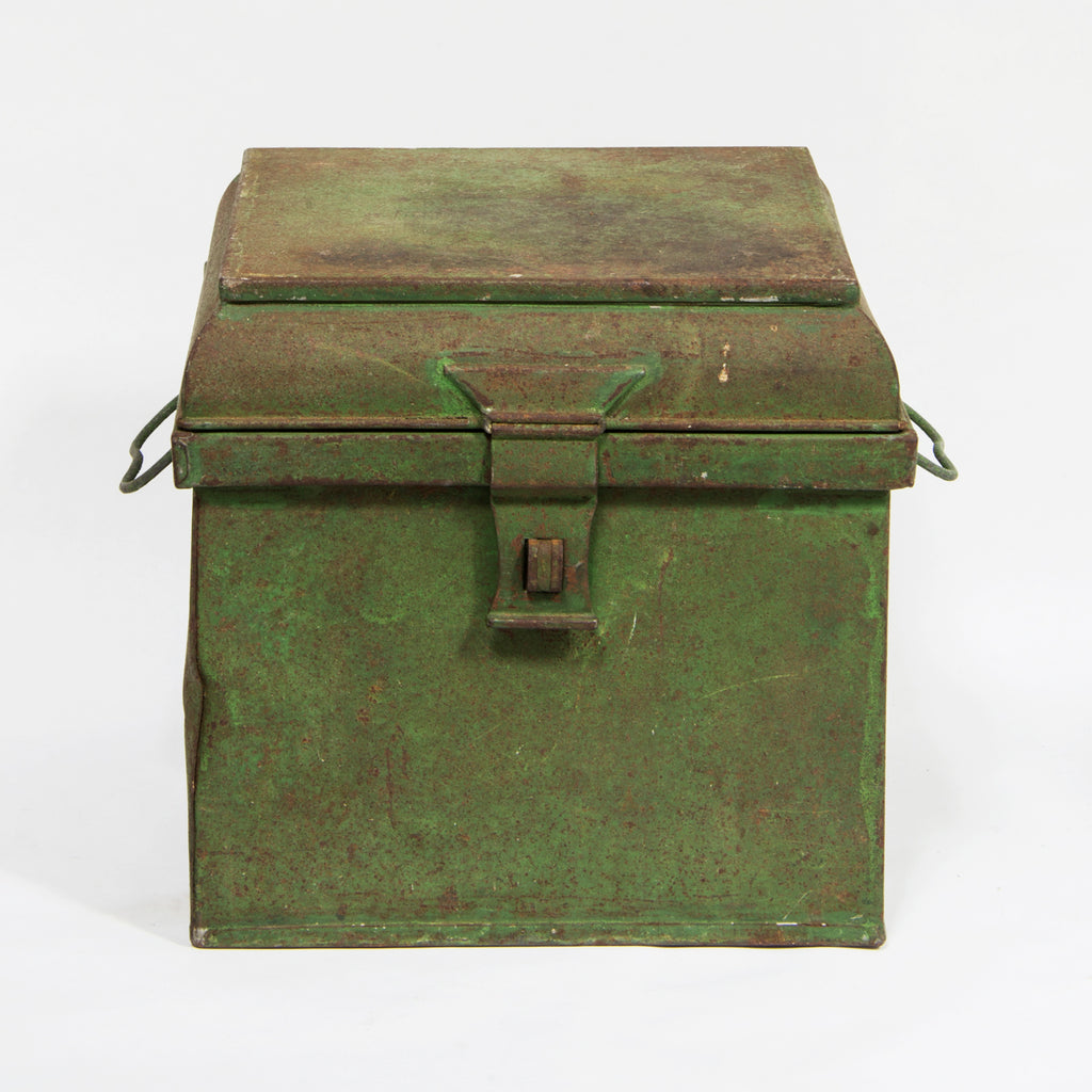 A Victorian spice tin with a chamfered stepped lid, original green painted finish, twin handles and hasp.