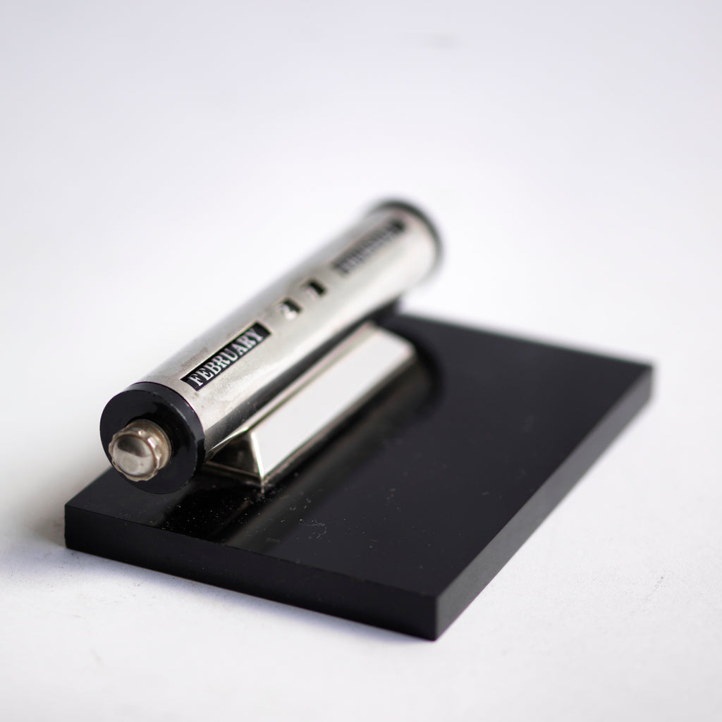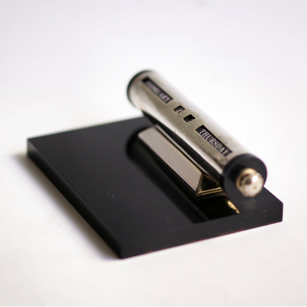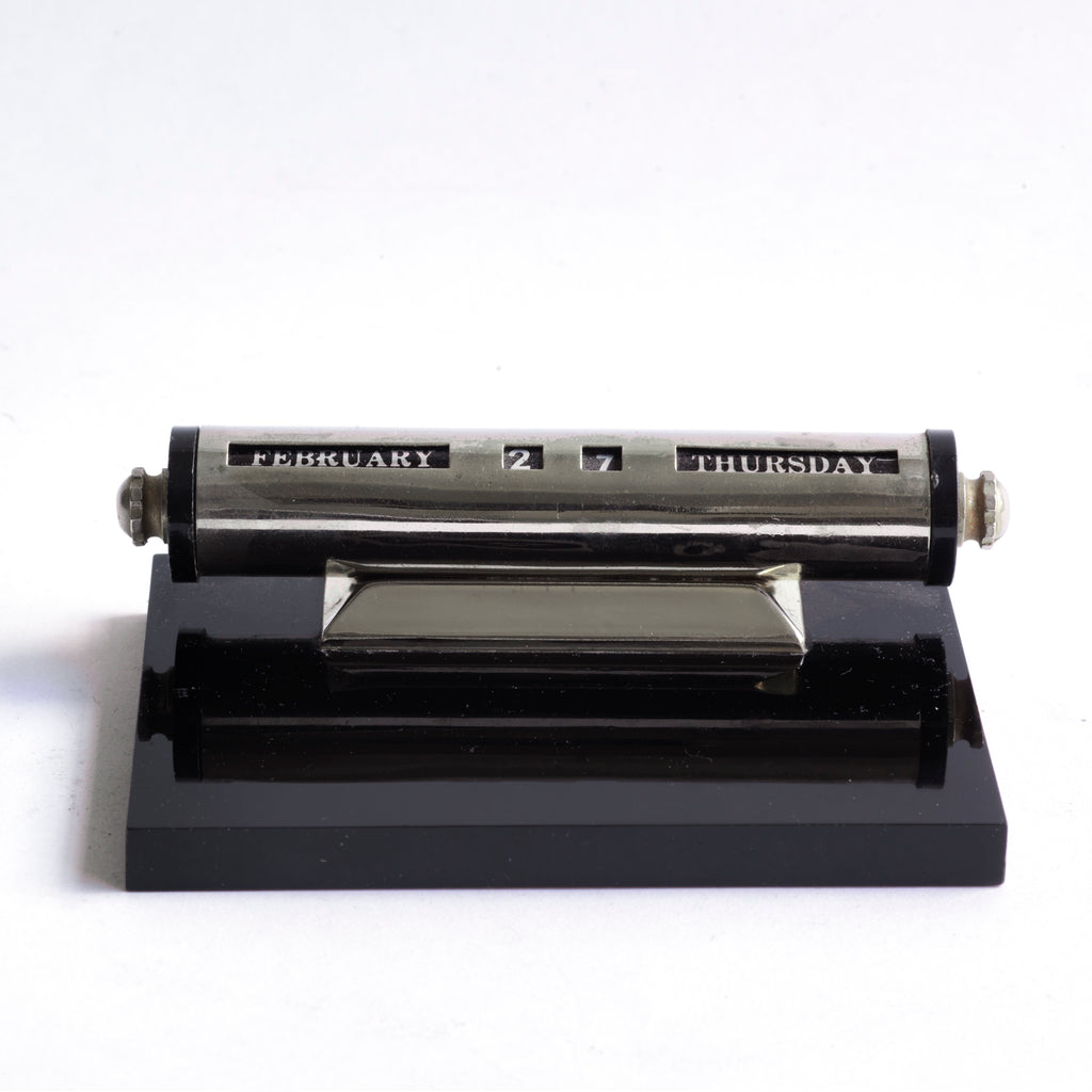 A super-cool 1930s chromium plated perpetual calendar mounted on a black perspex base. The months are adjusted by swivelling the black Bakelite discs either end, and the date is changed by turning the chrome knobs. A clever piece of kit, and the smartest way of keeping today's date and month on your desk.