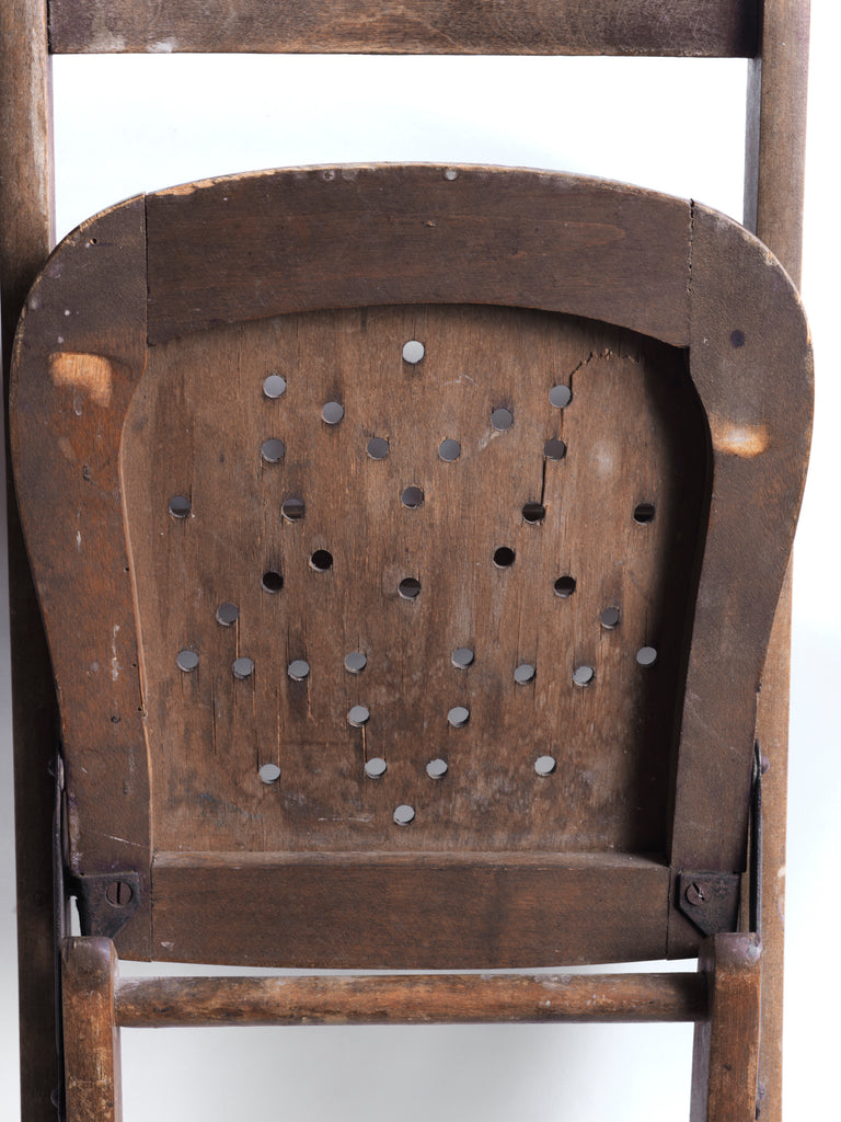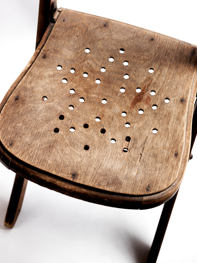 An elegant Edwardian folding child's chair, which was purchased some years back directly from the church hall in Winchelsea, East Sussex, UK. The seat is of ply with pierced holes arranged in a star-shaped pattern. The frame is beautifully constructed and designed to fold flat when not in use, and so can easily be stored.
