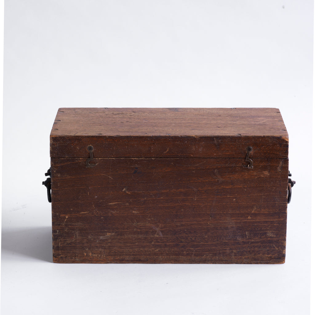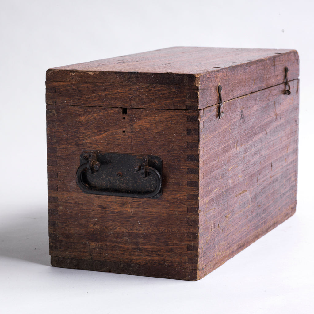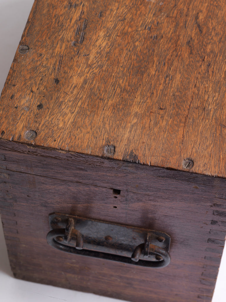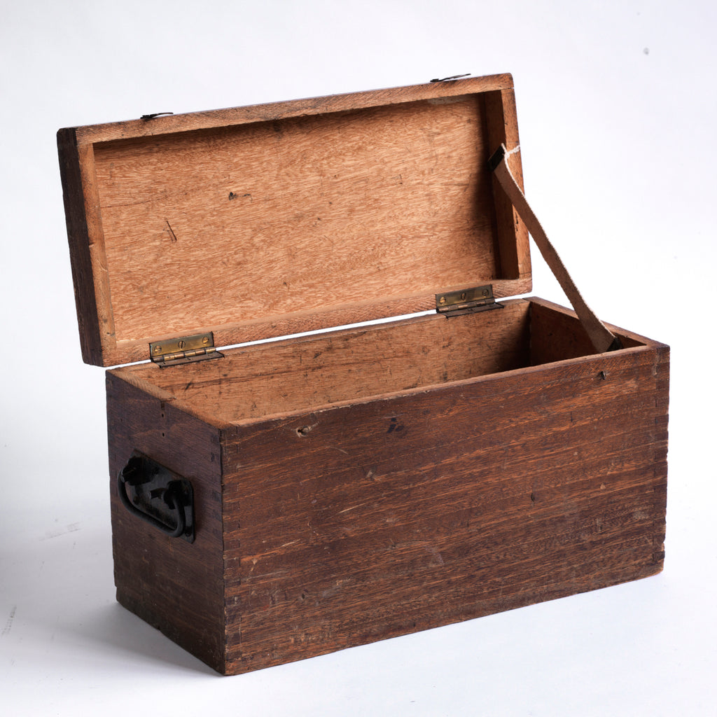 Simple, yet full of lovely details, this charming scratch-built 1920s oak box has twin hook lid fasteners, drop handles, dove-tailed corners, a screwed top lid, and inside, a strap retainer. Compact, neat and tidy, it's perfect for tools and craft storage.