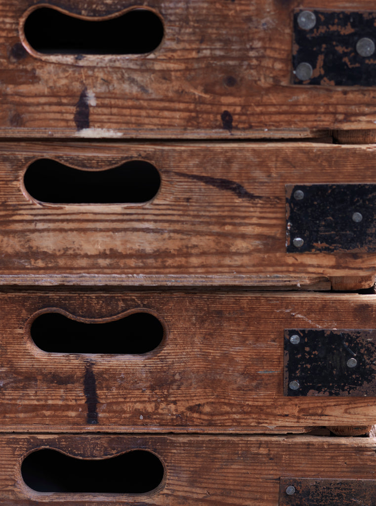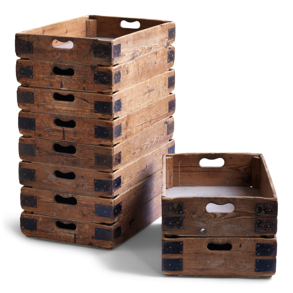 Condition: having seen decades of factory use, these crates now bear the scars of their toil. Yet it's these scuff marks and scratches that make their patina; and although we've had them carefully cleaned and buffed, their true character remains.