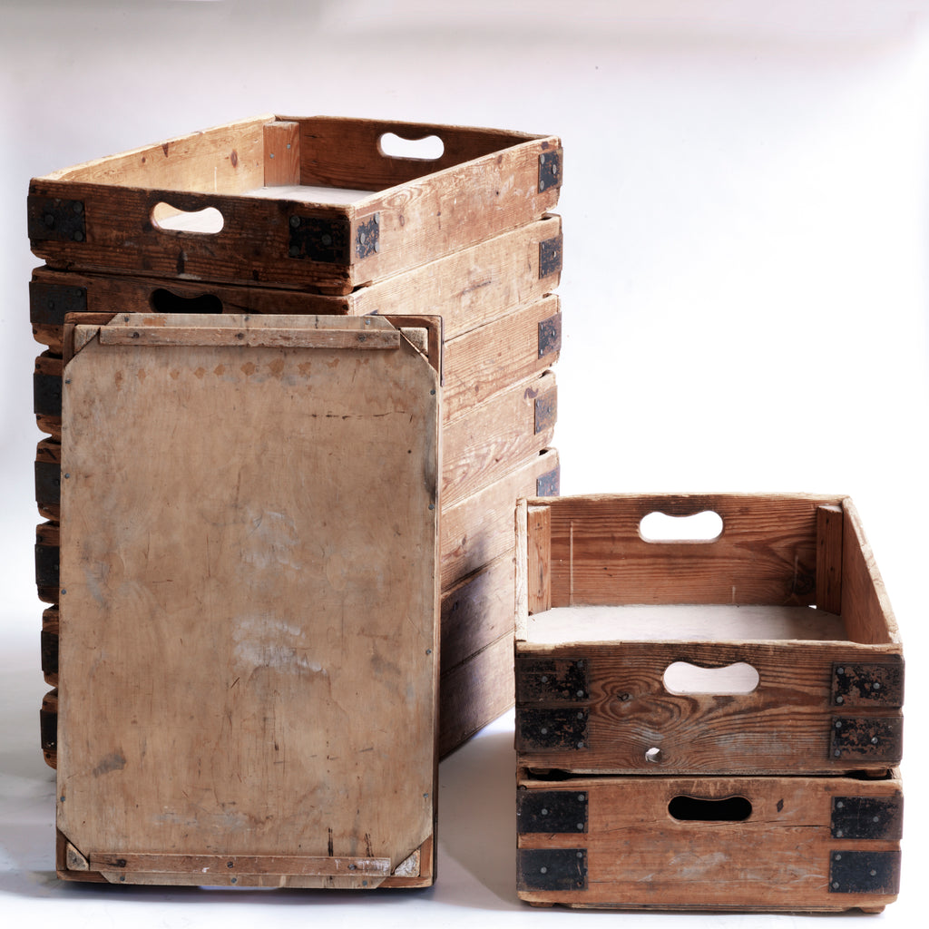 We have just ten of these wonderful vintage potter's crates. Once used in the Staffordshire potteries for transportation of greenware (unfired ceramics) to the kiln, each pine potter's tray has time-worn slot handles, metal corner braces, and a plywood base. They are great for home storage, as they can be stacked one on top of the other, and would work well in the kitchen, office or shed as sliding drawers under a table or other work surface.