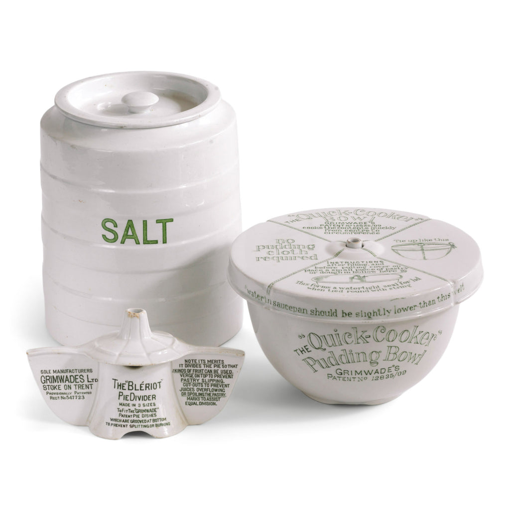 A collection three 1920s ironstone kitchen ceramics by Grimwades Ltd, Stoke On Trent - the leading manufacturers of Ironstone kitchenware back in the day. The "Bleriot" pie divider is particularly rare, and all items are charmingly decorated with Grimwades' classic typography and gorgeously graphic illustrations of their cookware. We are selling these items separately, so once you have read the details of each, please make your choice in the box below.