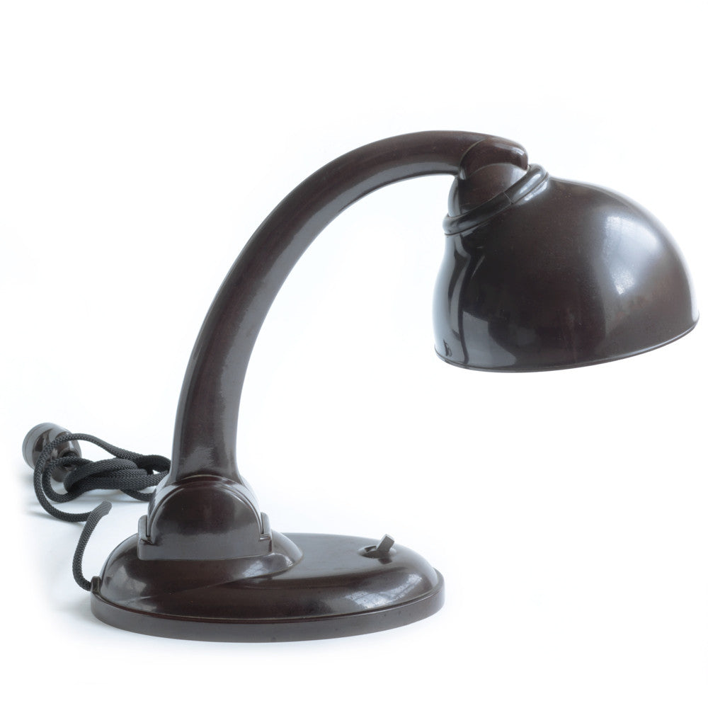 Please note: The lamp we have at present is black Bakelite with a hint of brown. The cloth covered cable and plug may vary from that depicted. The original Bakelite plug is a two-pin German plug, however we can supply a three-pin UK plug adaptor.