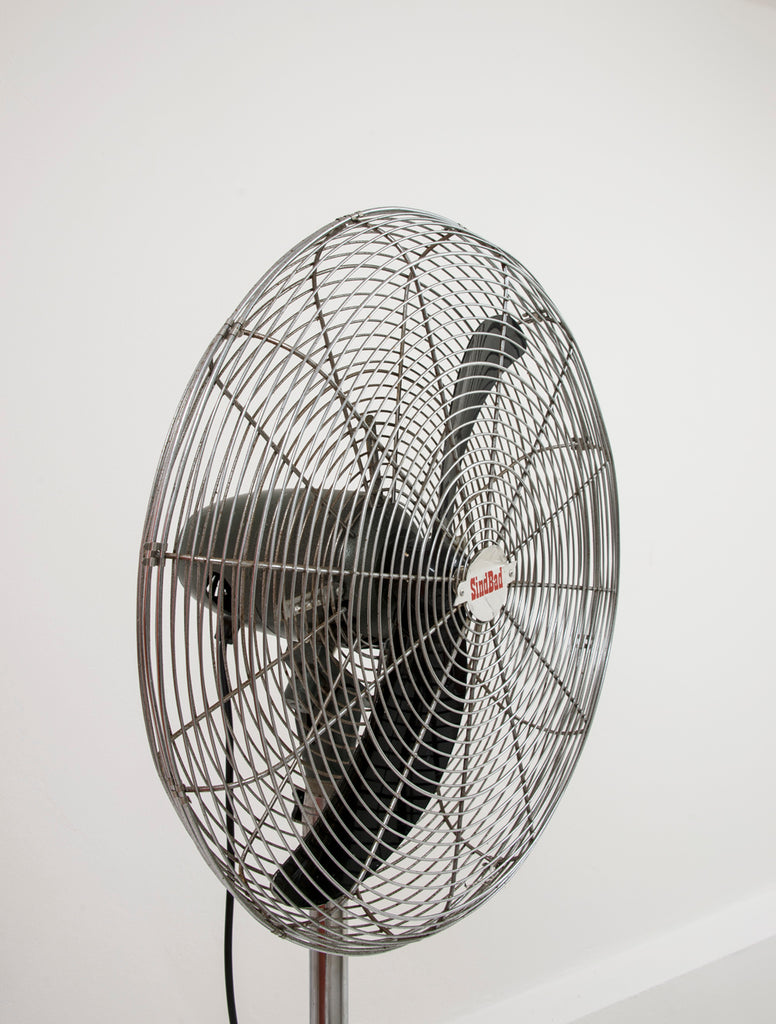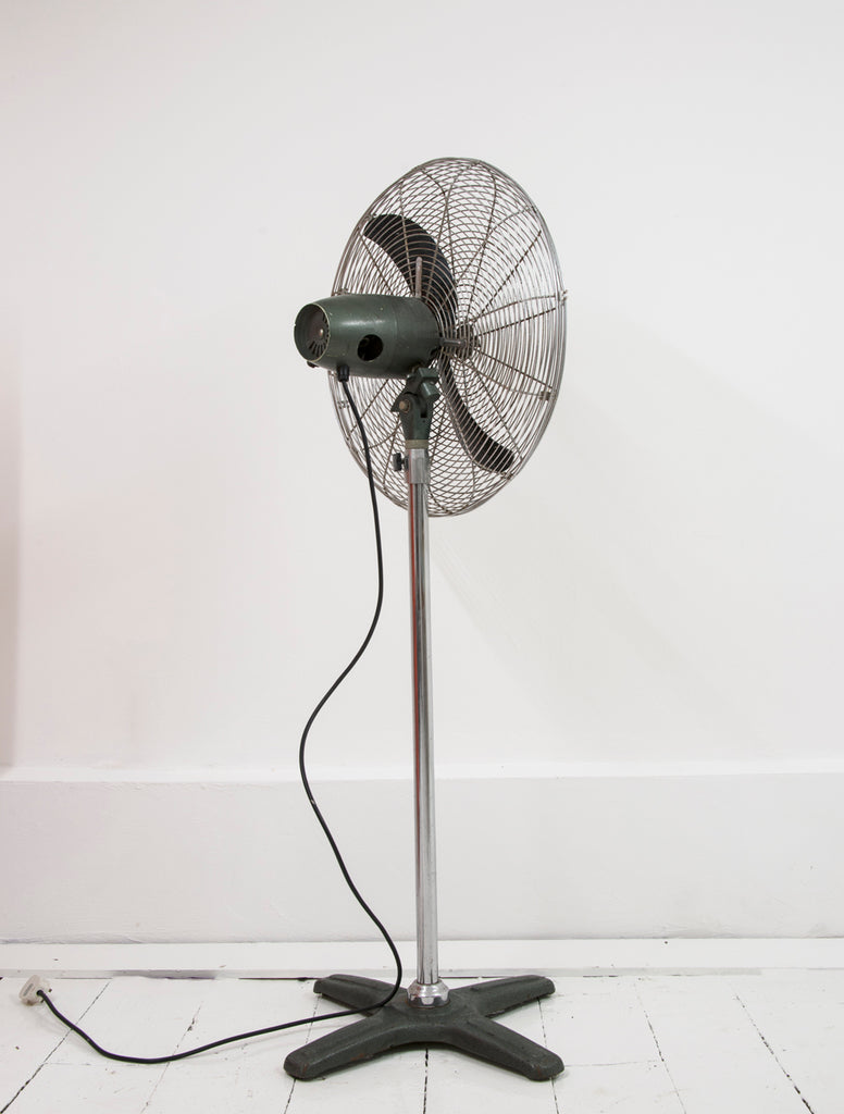 An extra-large floor-standing oscillating fan with makers label, Sindbad. The steel motor casing and the floor-standing base have an industrial green patination. The two are connected by a chromed shaft which slots into the cast iron base stand.
