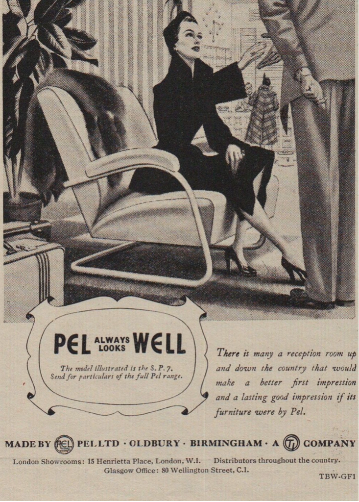 PEL were the leading manufacturers of modernist tubular steel furniture in Britain. Established in 1931 in Oldbury, near Birmingham, PEL worked with the top designers of the day, such as Serge Chermayeff (co-architect of the De La War Museum, Bexhill) to design desks and chairs for BBC Broadcasting House; with Wells Coates, to design tubular steel furniture to furnish Coates’ landmark luxury seafront flats at Embassy Court, Brighton; and with Oliver Percy Bernard who designed PEL’s classic cantlivered SP4 chair.
