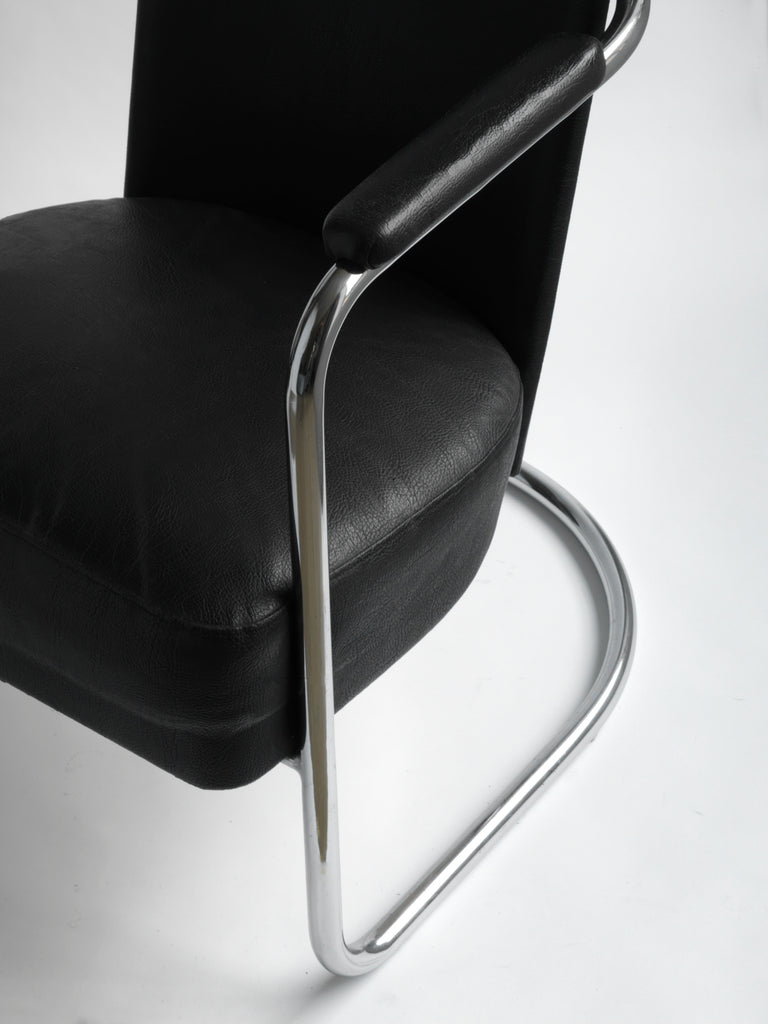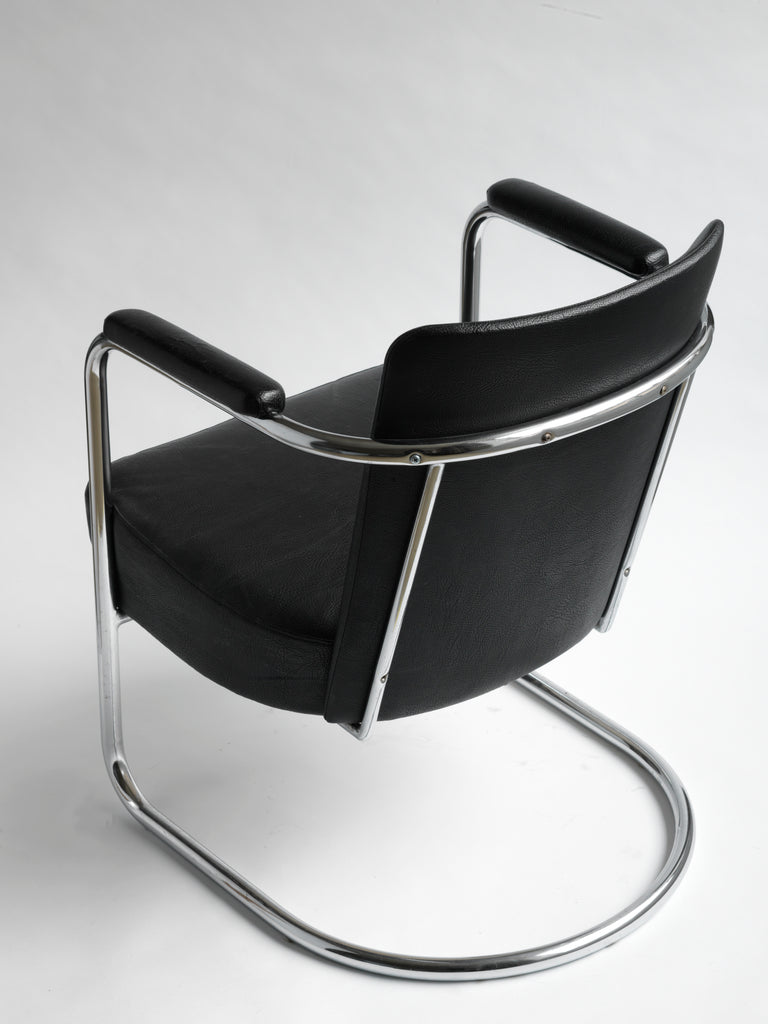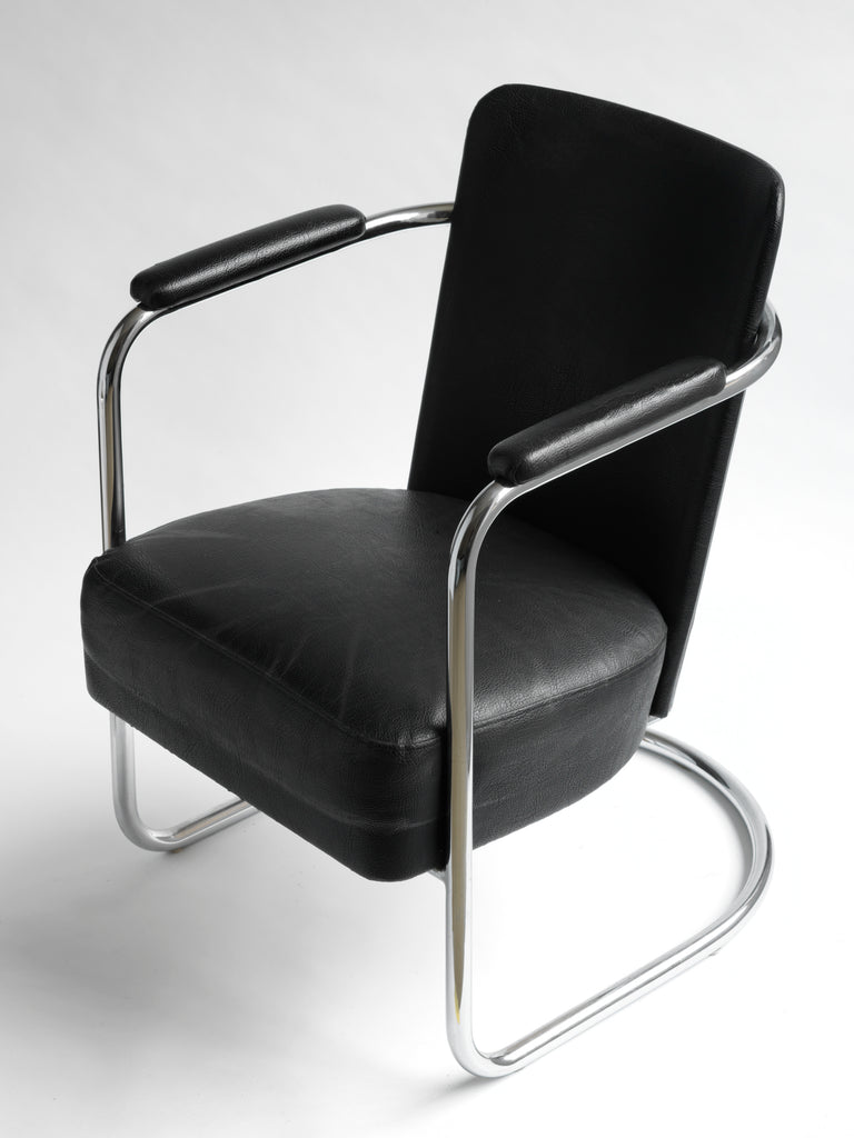 An elegant and rare tubular steel modernist armchair attributed to PEL (Practical Equipment Ltd) with continuous tubular chrome frame and horseshoe cantilever base. The chromium plated steel wraps around the back and forms the armrests, and it is upholstered in its original black leatherette. The chair is an excellent example of British modernism which was influenced by the 30s designs of the German Bauhaus and their pioneering work in tubular steel furniture, and bears all the hallmarks and design details of Practical Equipment Ltd. It was most likely designed for PEL by either Oliver Bernard or Serge Chermayeff. It is rare to find the original upholstery and chromium plating in such good condition.
