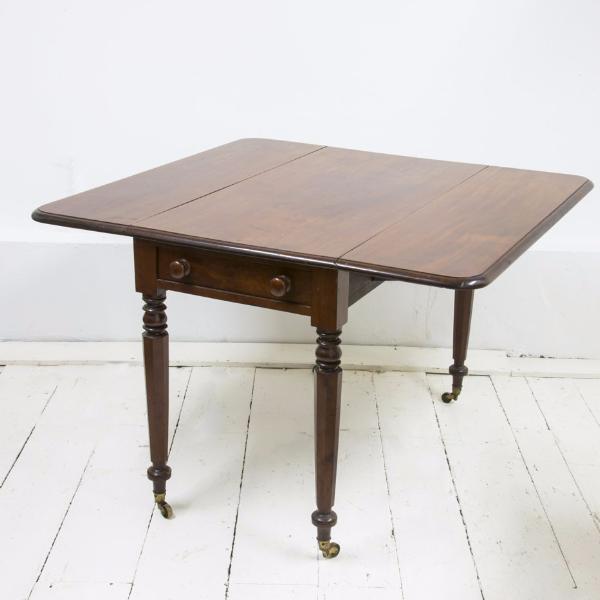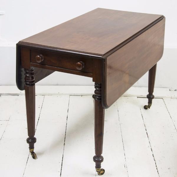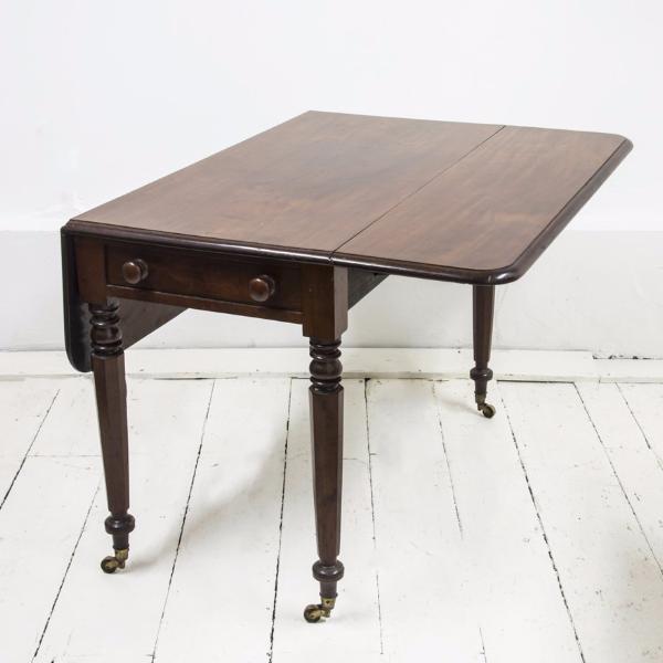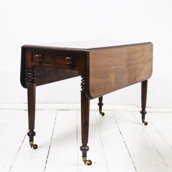 An elegant high quality solid mahogany Regency Pembroke table with single drawer on four faceted and turned legs, set on castors. A very handy and compact piece of furniture for the smaller home.  When part extended it can be used as a desk or for supper for two; fully extended it can seat several people for dinner; and when fully collapsed it can act as a hall or side table.