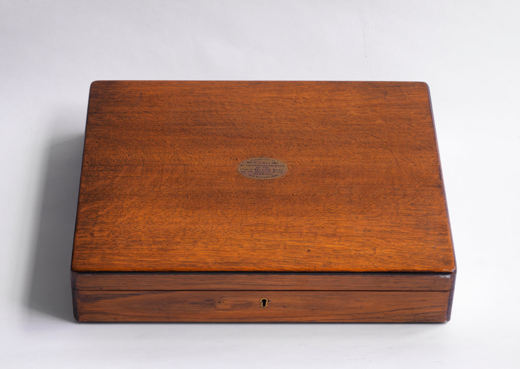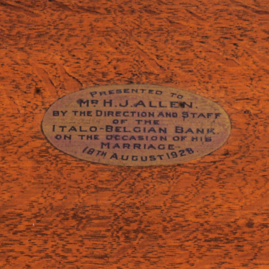 An extensive 1920s silver plated 54 piece canteen of cutlery by E J Fairbairns Ltd, Sheffield, and in its original blue felt-lined box. The set is housed in an oak veneered box with hinged lid, and the top of the lid has inset a presentation brass plaque that reads "Presented to Mr H J Allen by the direction and staff of the Italo-Belgian bank on the occasion of his marriage 18th August 1928". The set is for 6 people and comprises of: