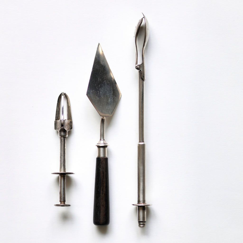 These beautifully crafted dining tools are designed to grab, scoop and spread. The three pronged pincer and the clamping scoop are ideal for the elegant retrieval of pickles and olives from awkward jars; and the trowel-shaped knife is perfect for the spreading of pate, butter or cream cheese. They have a wonderful weight and the trowel has a beautifully turned, polished ebony handle. The long scoop is marked "Patent Made in England EPNS".
