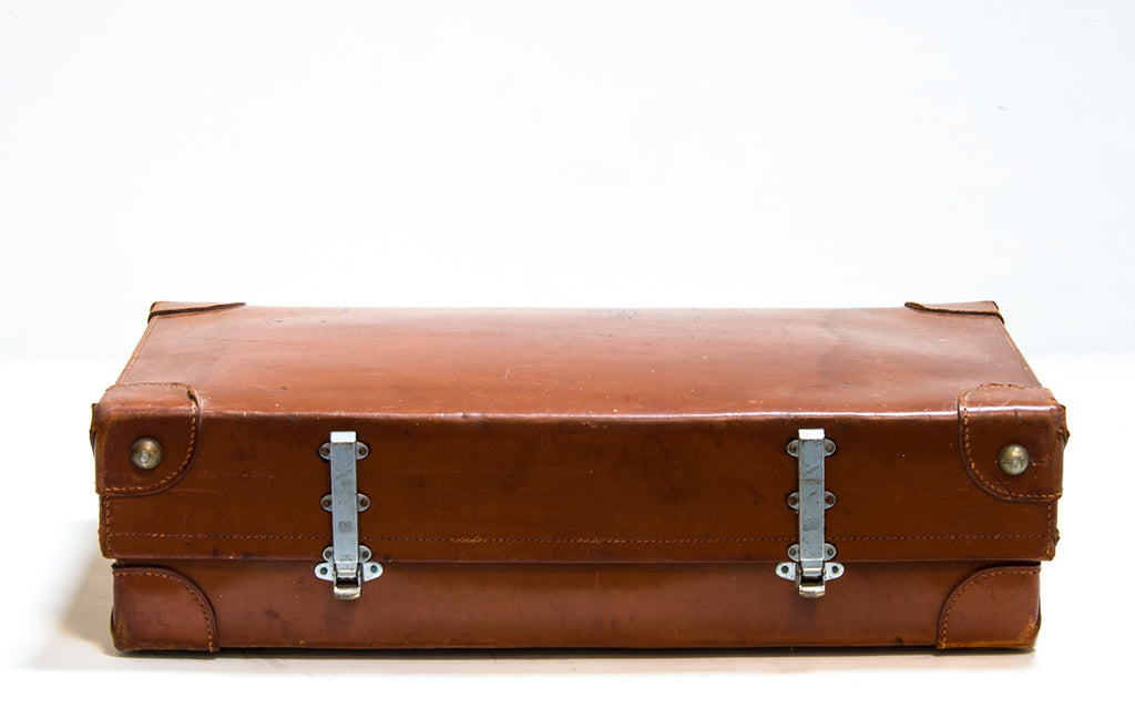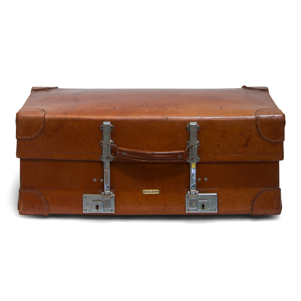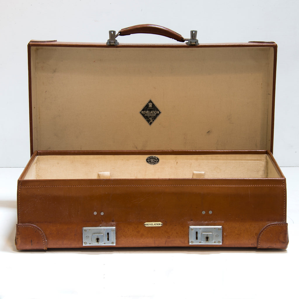 A good-looking expanding leather suitcase with leather corners labelled "Revelation British Made". The revelation being this suitcase expands into the depth of a trunk. The hinges and the front hasps elongate, turning the case into almost twice its size - see image. A Prince of Wales feathers label inside the lid denotes it had Royal Appointment status. A perfect storage solution for that ever-expanding collection.