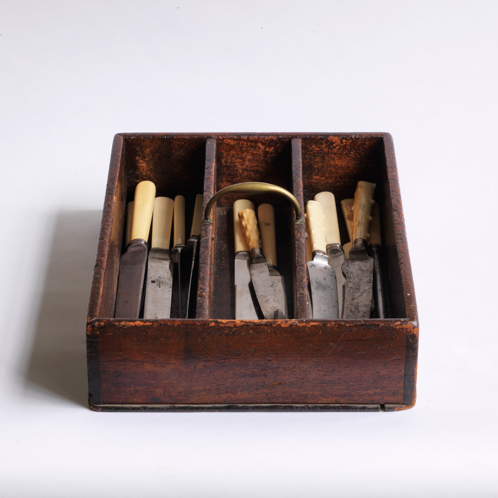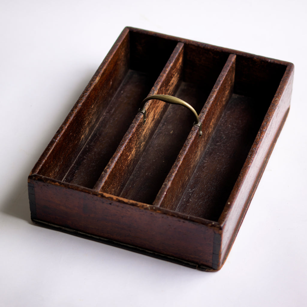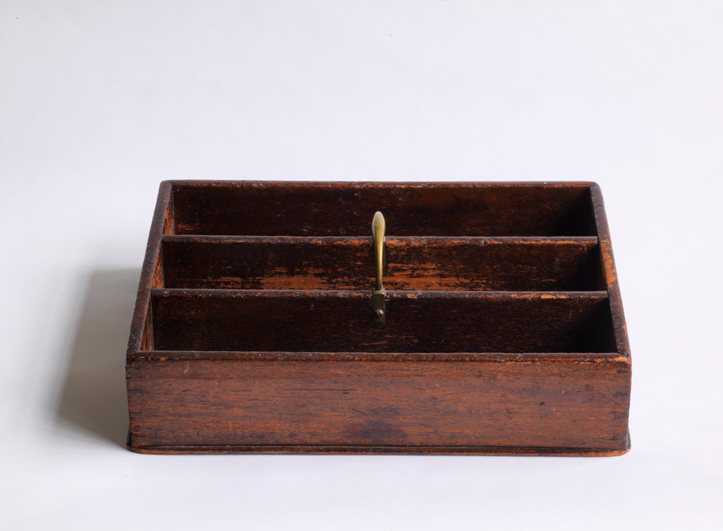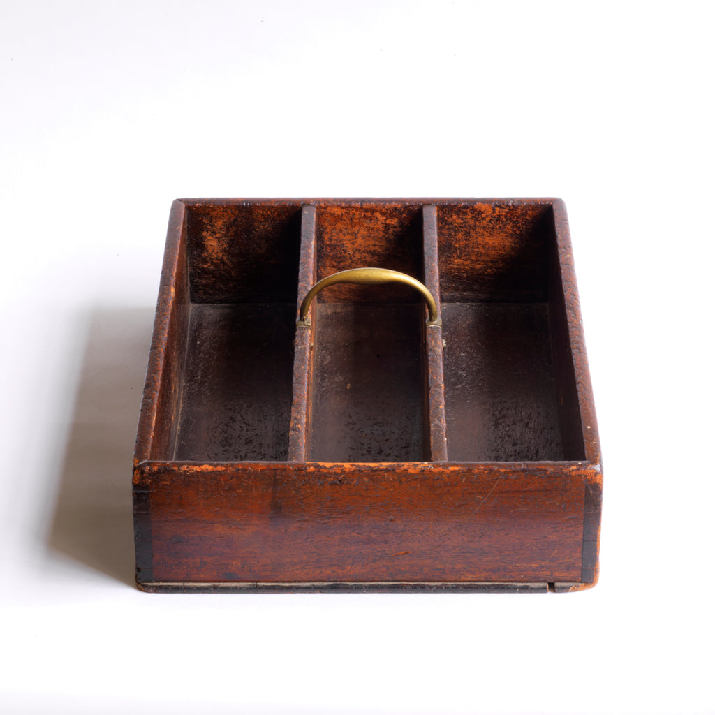 A well proportioned Georgian housekeeper's tidy or cutlery tray with brass handle and original stain finish. It could also be used to house utensils, tools, artist's materials or act as a shoe cleaning box. In fact it's totally purposeful.