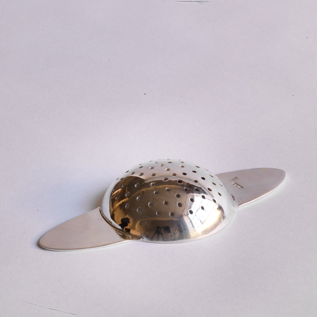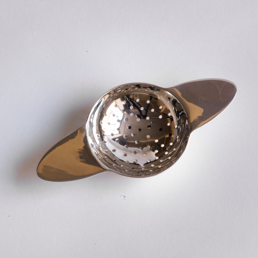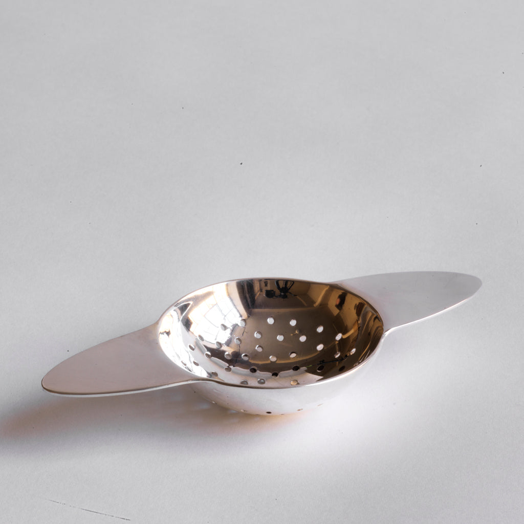 A beautifully designed mid-century twin-handled silver plated tea strainer. We have had this item re-silver plated, so it is in excellent condition.