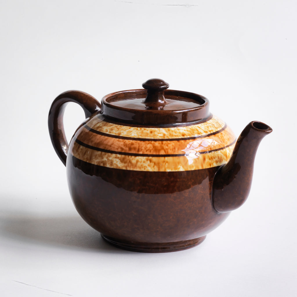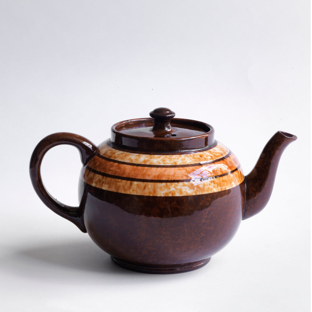 The Brown Betty is the archetypal everyday teapot, and its heyday of design lies in the first part of the twentieth century. Affordable, utilitarian and unpretentious, it was to become a design classic. The red Etruria Marl clay resulted in a ceramic with high heat retention and so naturally suited the making of teapots; while the Rockingham glaze - creating a streaky finish as it was fired - helped disguise any tea dribbles while the pot was in use. Come the 1920s, it was every household’s teapot of choice, being produced with varying striped bands of colour and marbling. By 1926 the Staffordshire pottery industry, such as the potteries of James Sadler & Sons and Joseph Bourne & Sons Ltd, was making near half a million Brown Betty teapots per week. The original Brown Betty with its mottled glaze and bands of colour is no longer in production, yet we constantly strive to source these early twentieth century vintage classics, and in as near perfect condition as is possible.