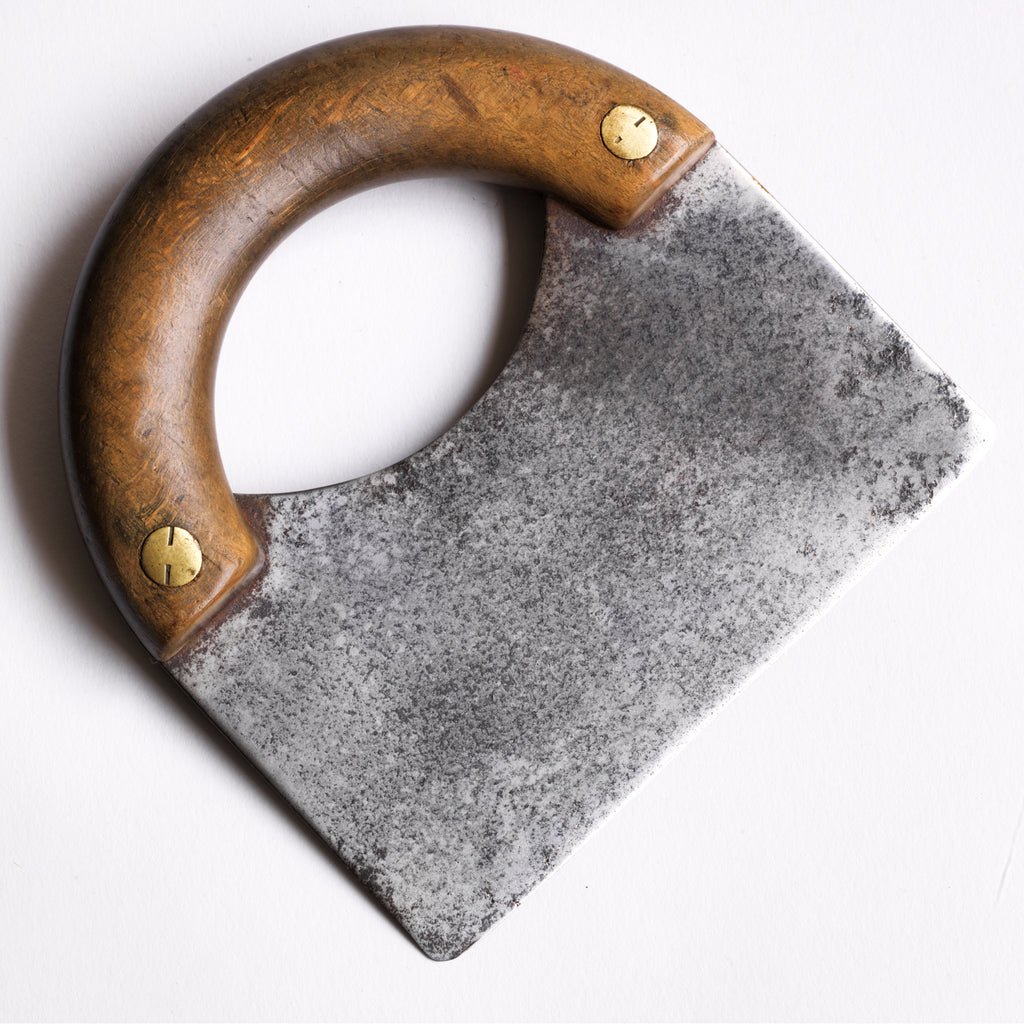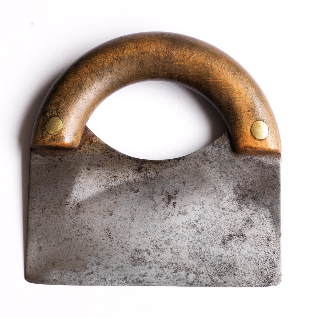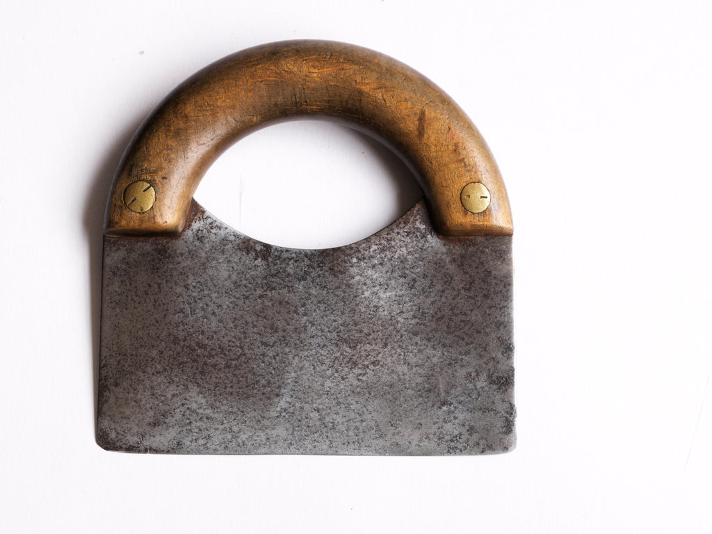 A very handsome Victorian kitchen chopper with a demilune brass riveted handle and carbon steel blade. It has a wonderful patina and a particularly smooth and comfortable handle, and is excellent for the chopping, slicing and scooping of herbs, garlic, leaves, dough, you name it.