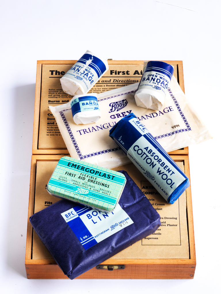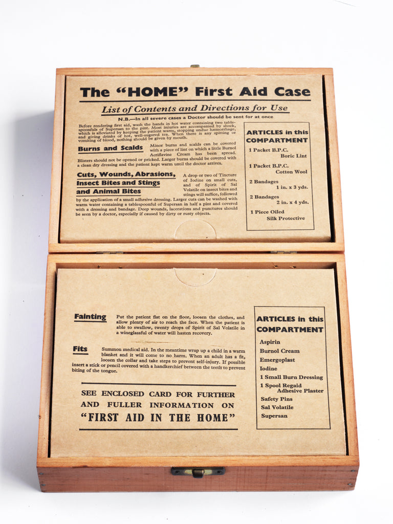 A super cute 1930s first aid box by Boots the Drug Co Ltd - now known as Boots the chemist - and complete with internal printed card divisions and original contents. The plywood top is stencilled "The Home First Aid Case, Boots", it has a front clasp, and has been barely used. The condition is wonderful, and the contents pristine, as if made yesterday.