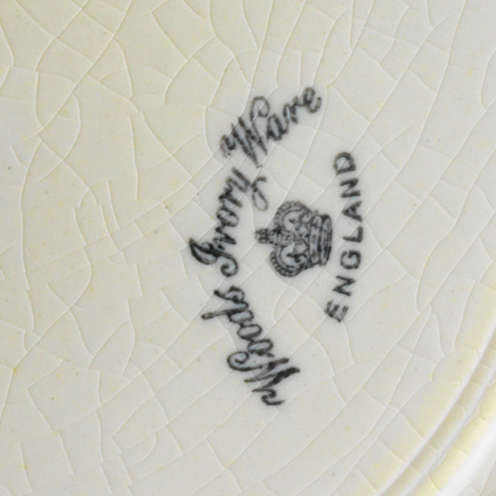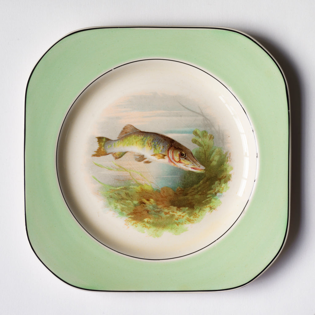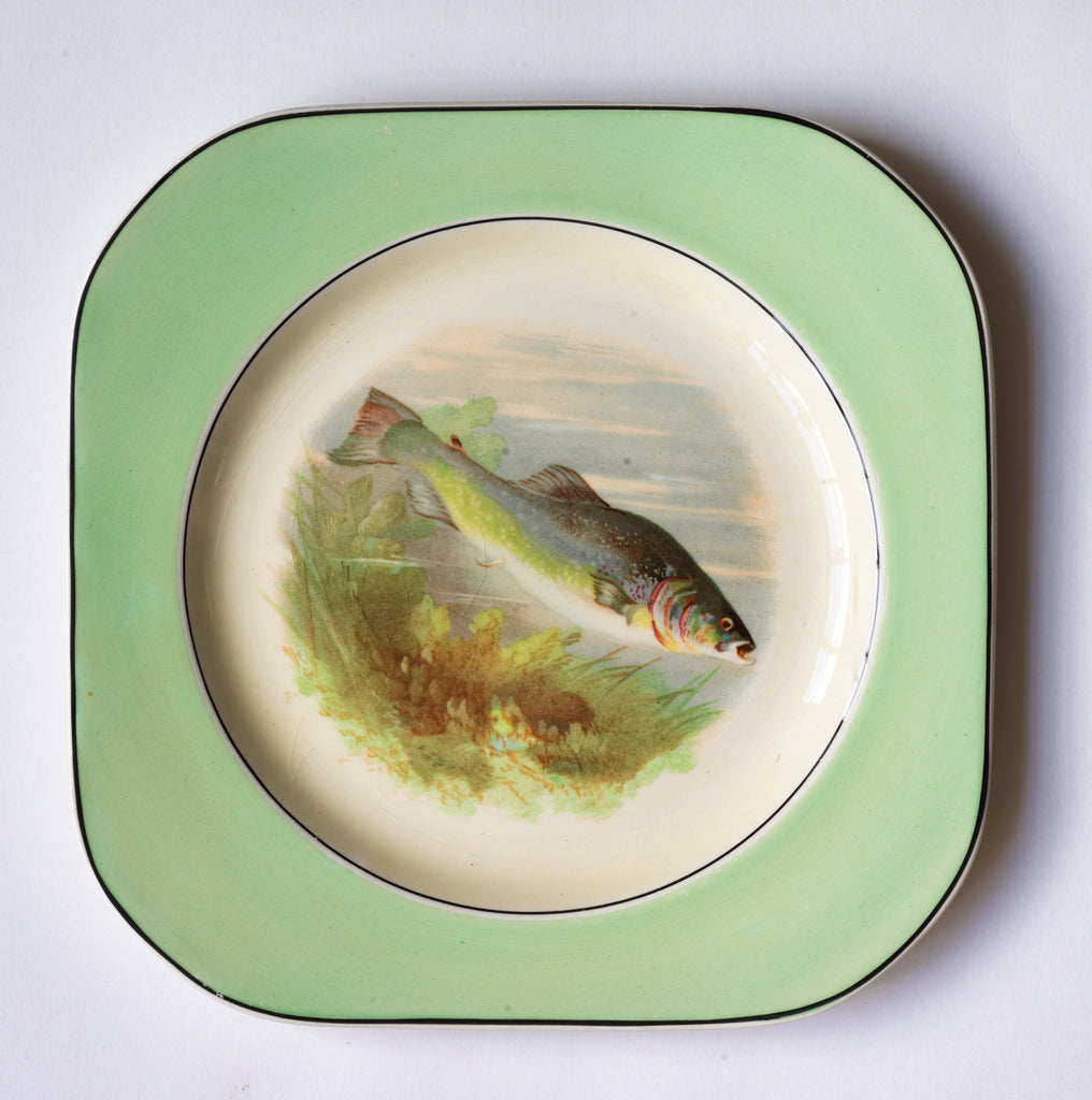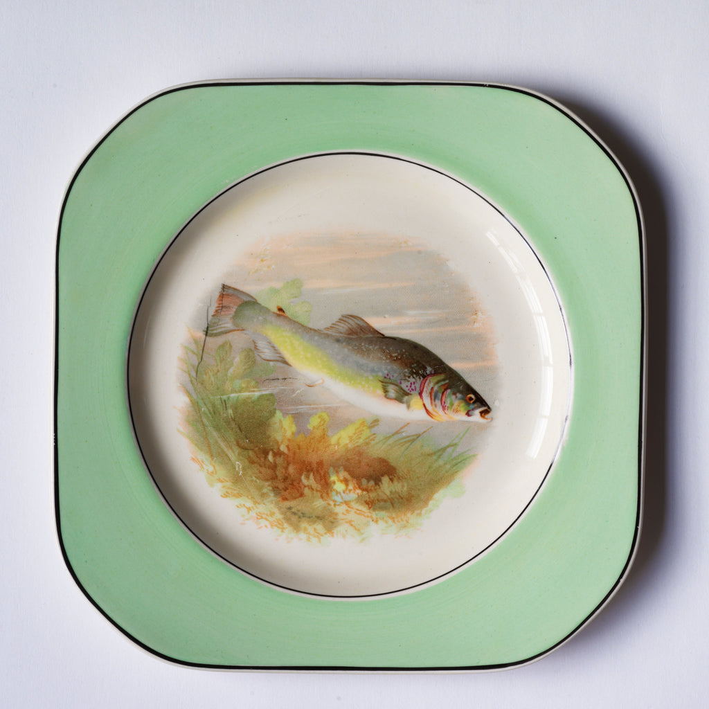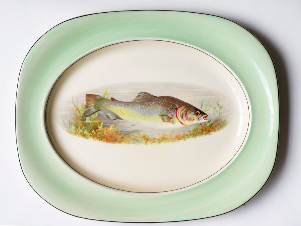 A glorious 1930s fish dinner service, complete with a large platter for serving a whole fish. Each piece is embellished with a fresh water fish, such as pike, perch and trout, and contained within a mint-green border. Each item is stamped "Woods Ivory Ware England" to its underside.