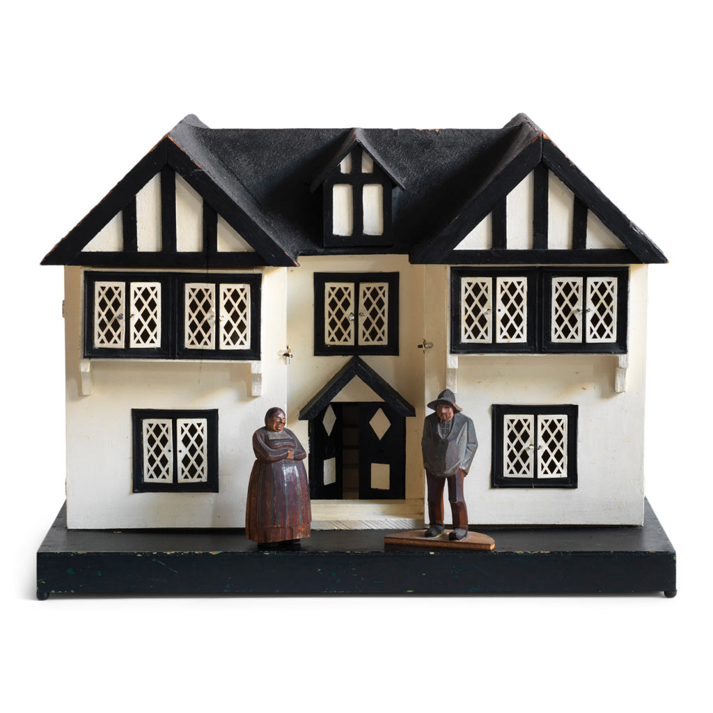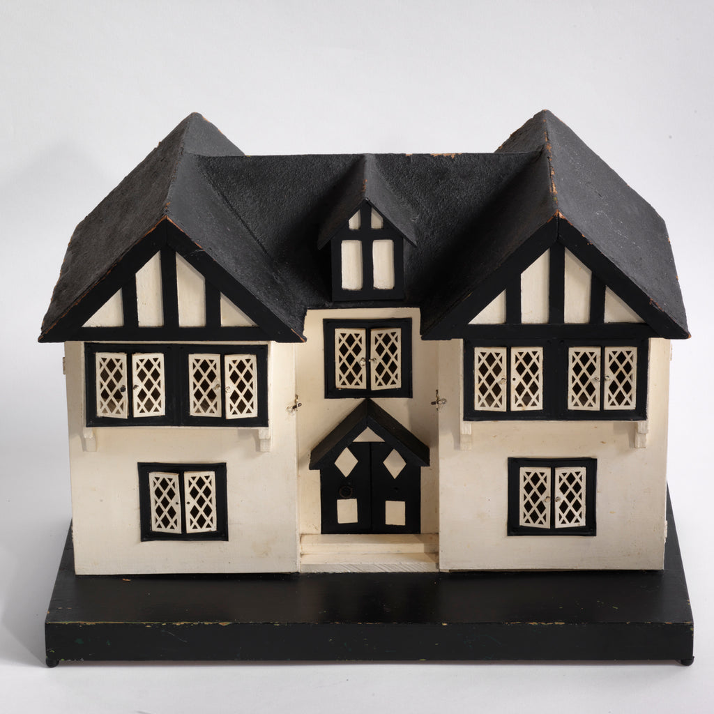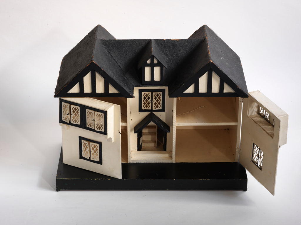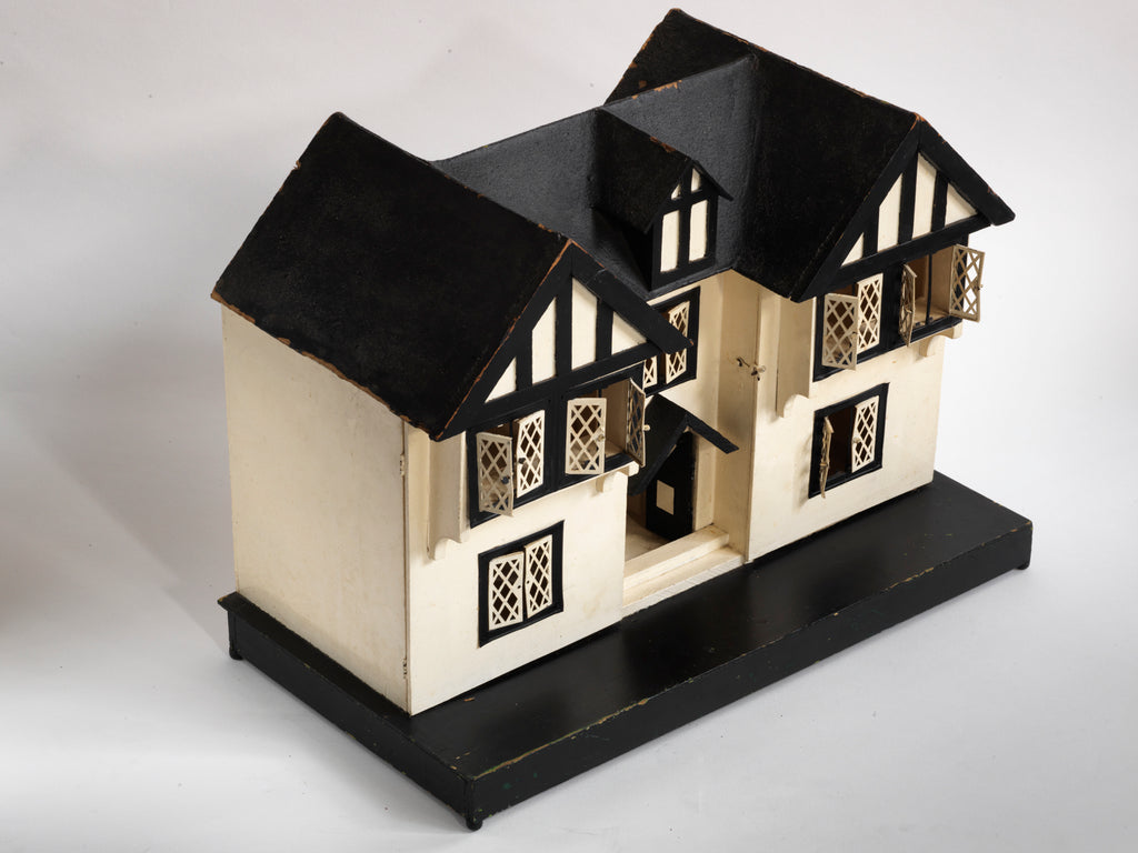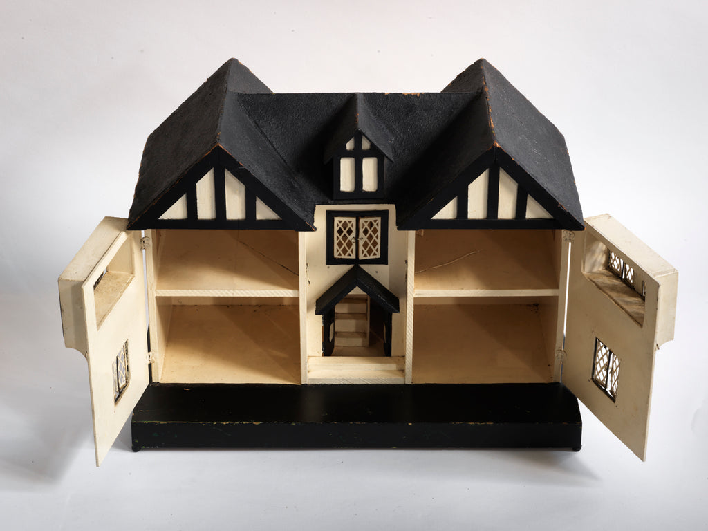 A Tudor style doll's house in the 1930s Mock-Tudor vernacular with twin jettied oriel windows and leaded glass style metal window frames. It has a double opening front, that hinges open to reveal four rooms, and the front door opens to reveal a staircase. The whole of the interior is painted cream.